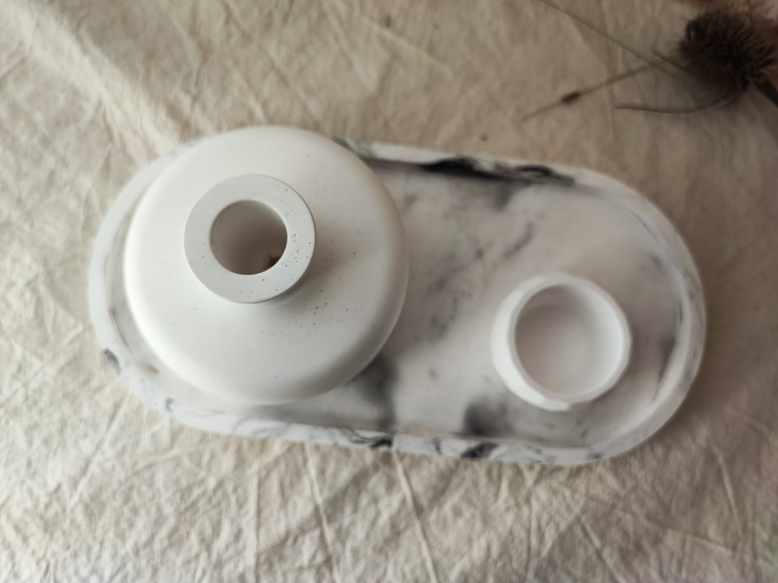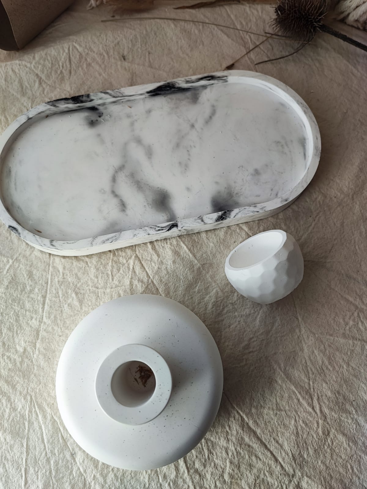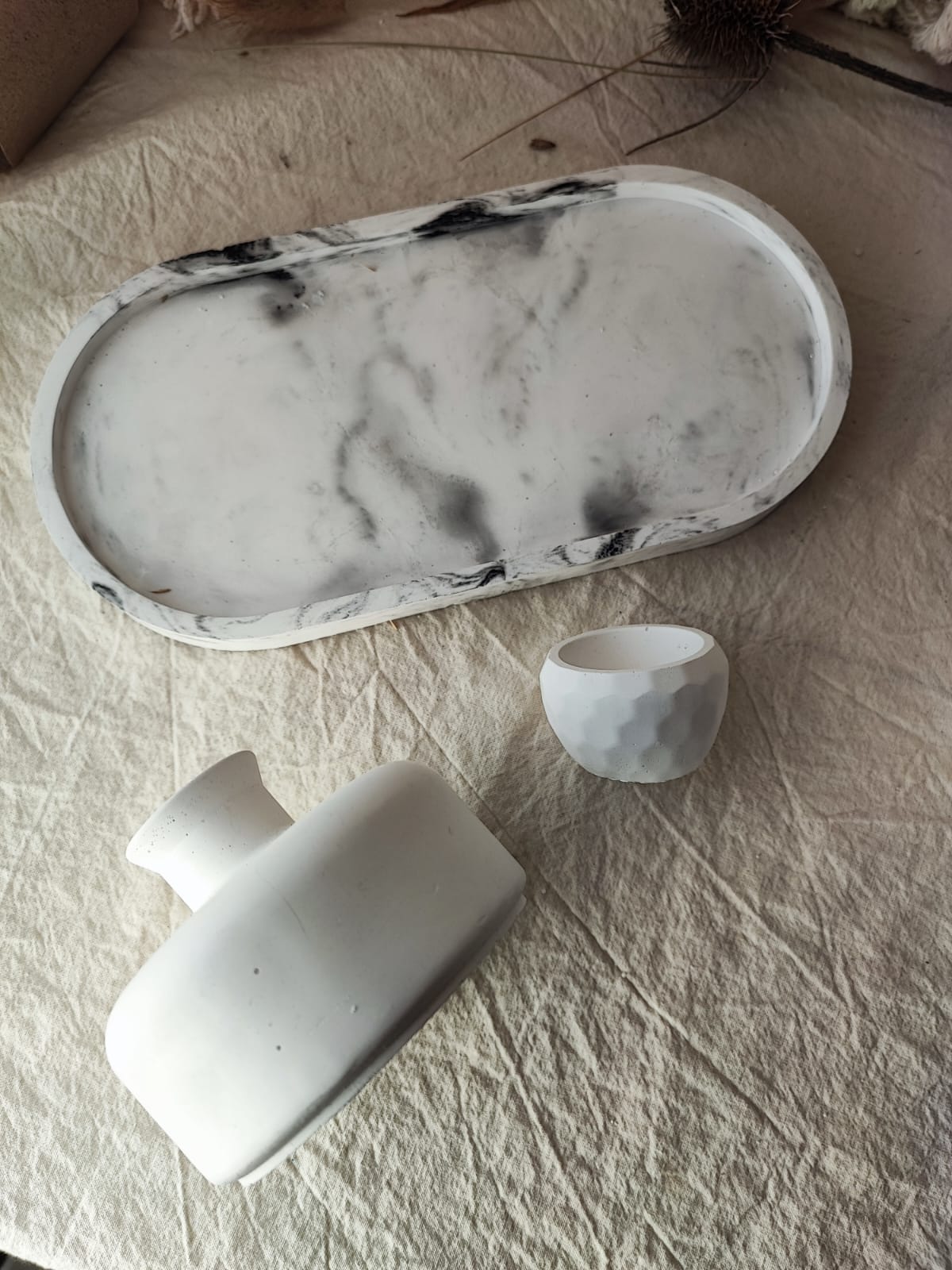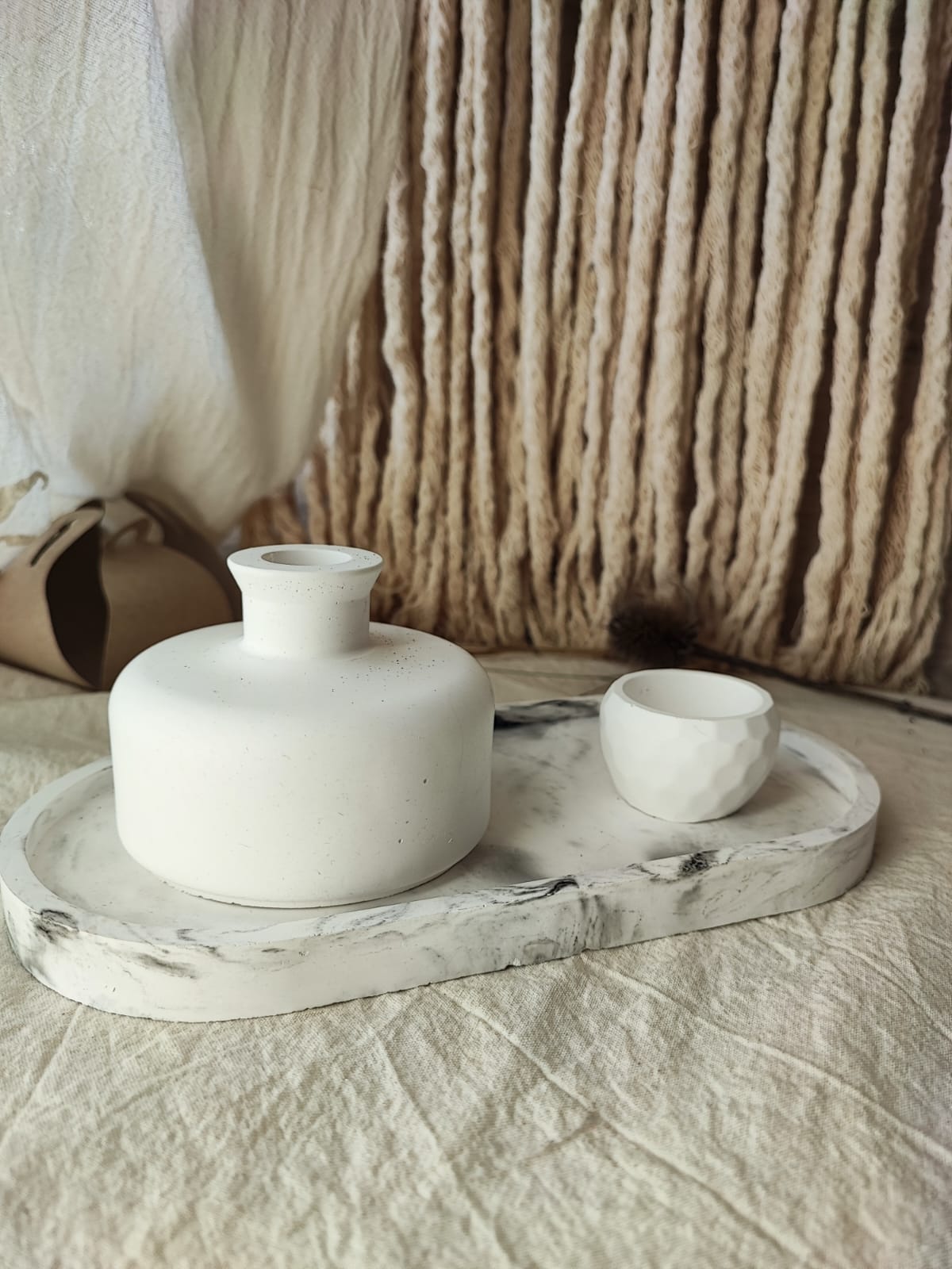 Hermoso set compuesto por bandeja oval grande con marmolado negro, florero liso bajo y contenedor mini. Material yeso cerámico. Son ideales para emprendedores y comercios.