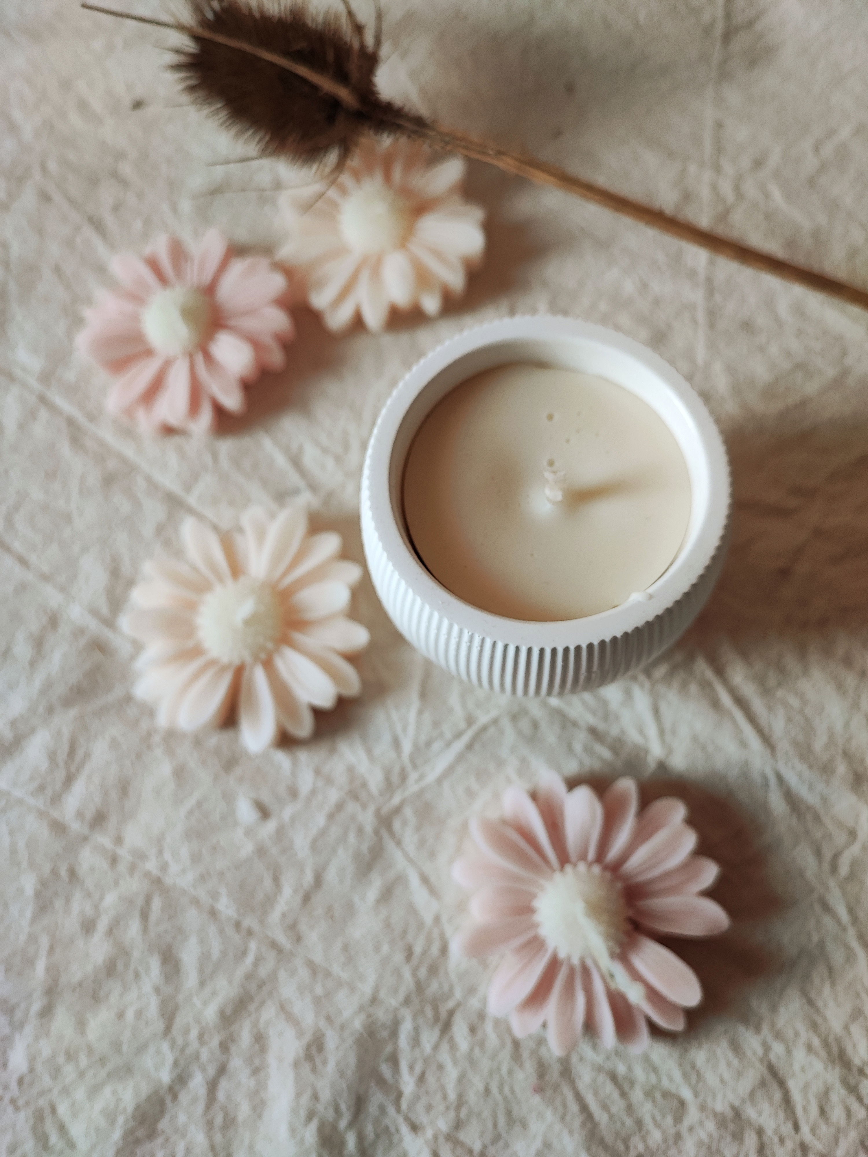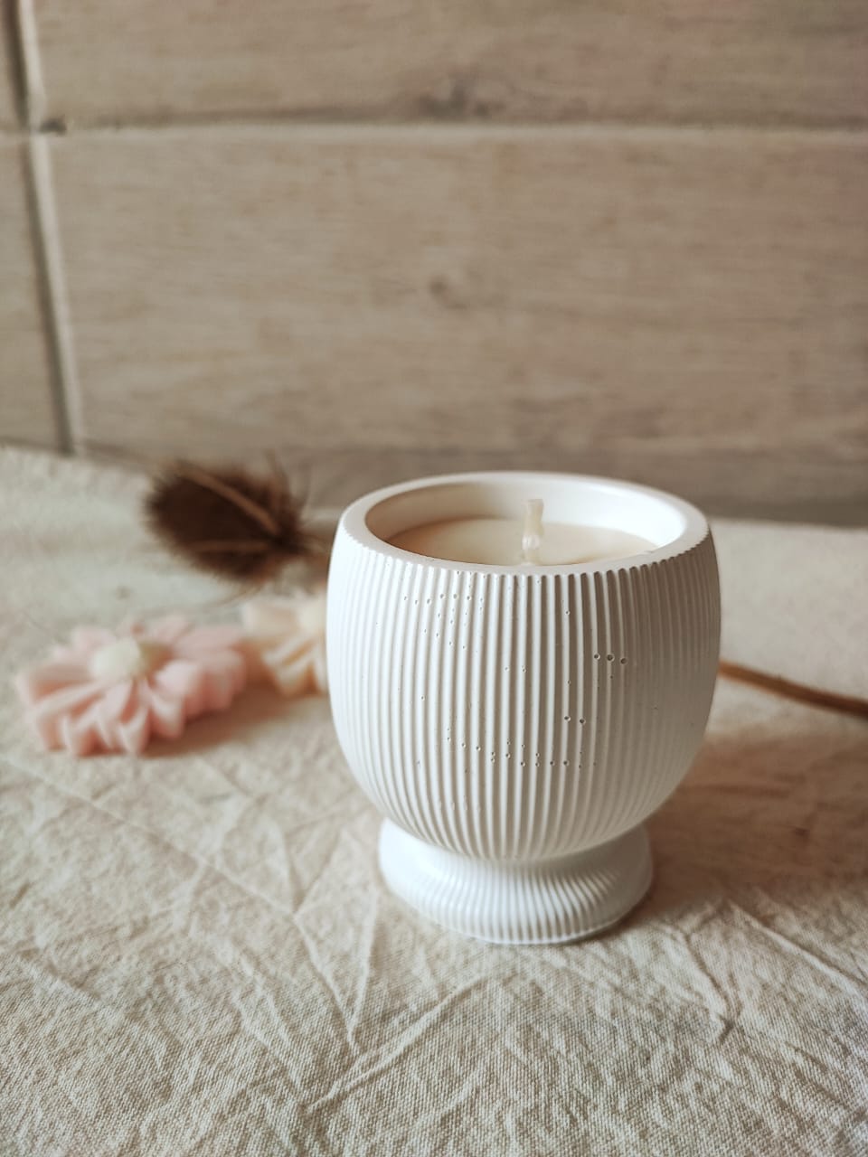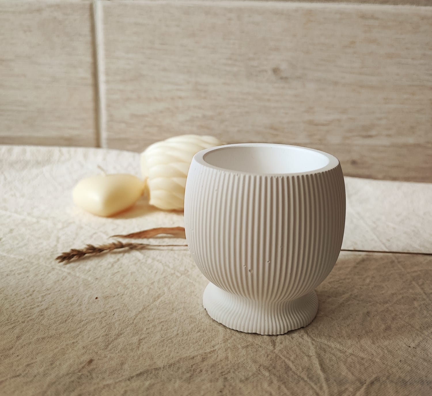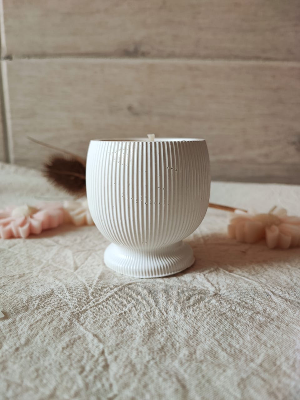 Muy bonita copita estriada contenedor, rellena con vela., Medidas 6cm de diámetro la base x 6,5cm de alto.. Material yeso cerámico en blanco, la pieza esta impermeabilizada y con vela. Son ideales para emprendedores y comercios.