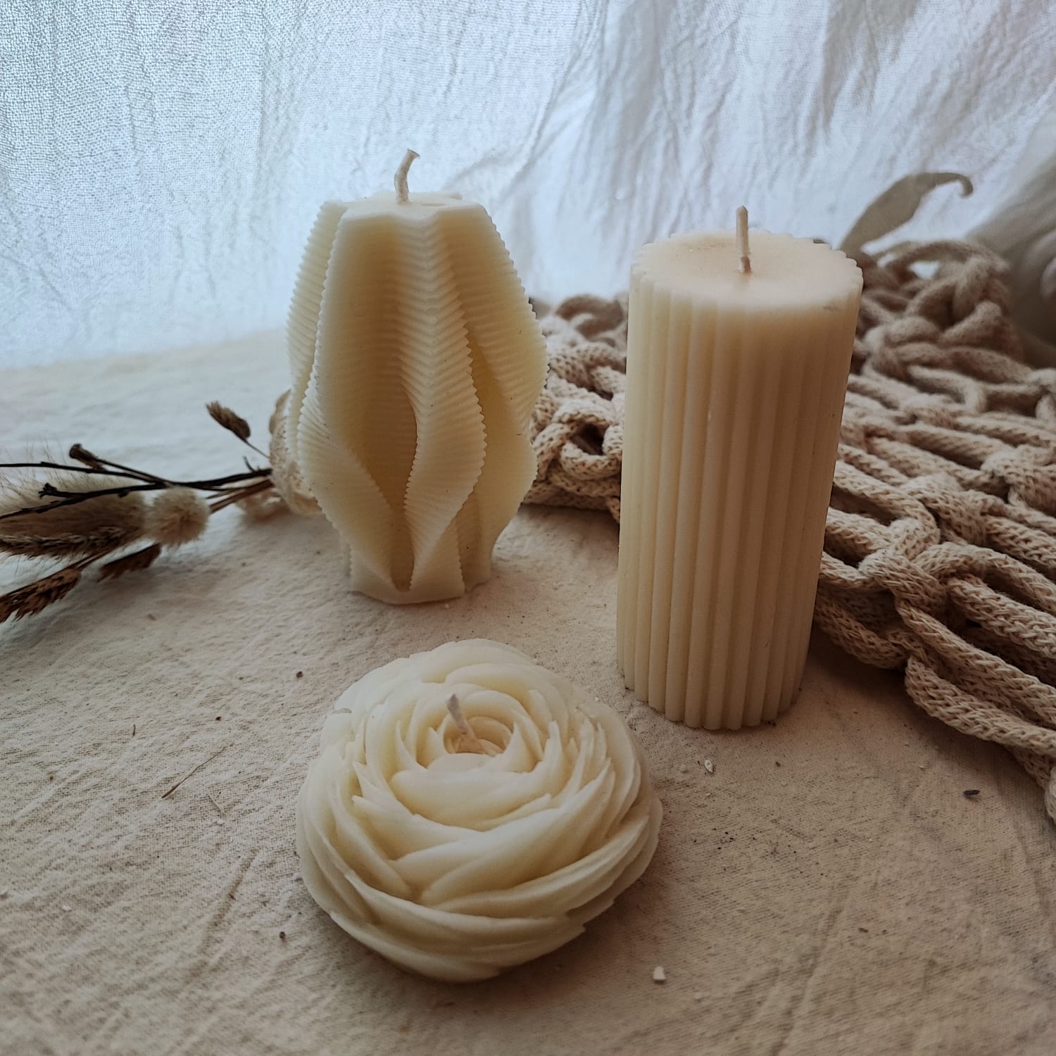 Trio de velas primavera, consta de una vela tubo alto estriado, una vela floral y una vela alga, despues de realizar la compra te pasamos listado de fragancias disponibles. El trio NO incluye el packaging