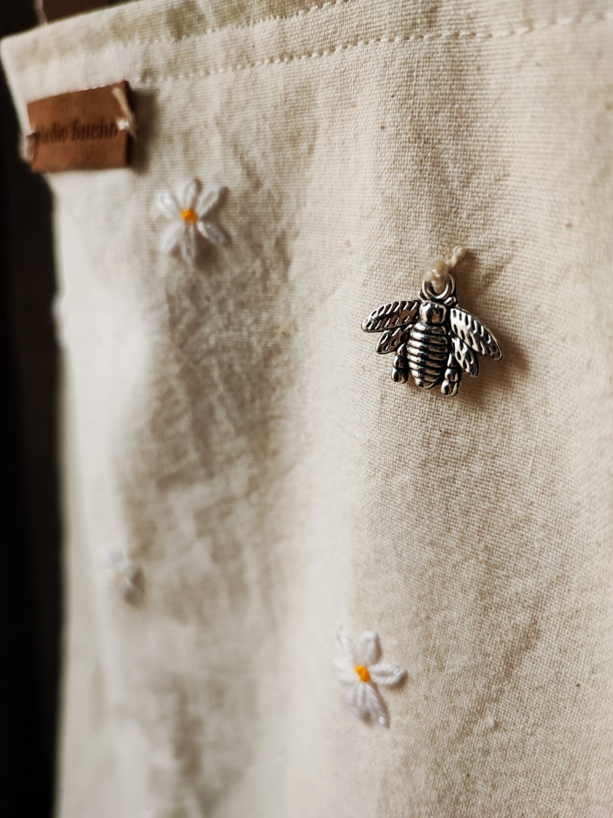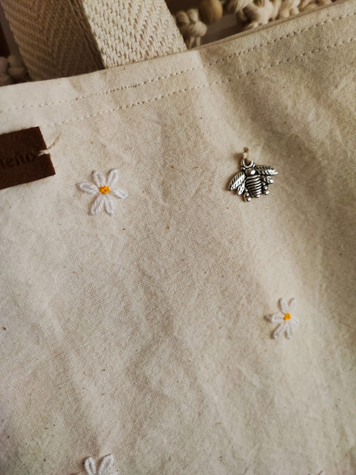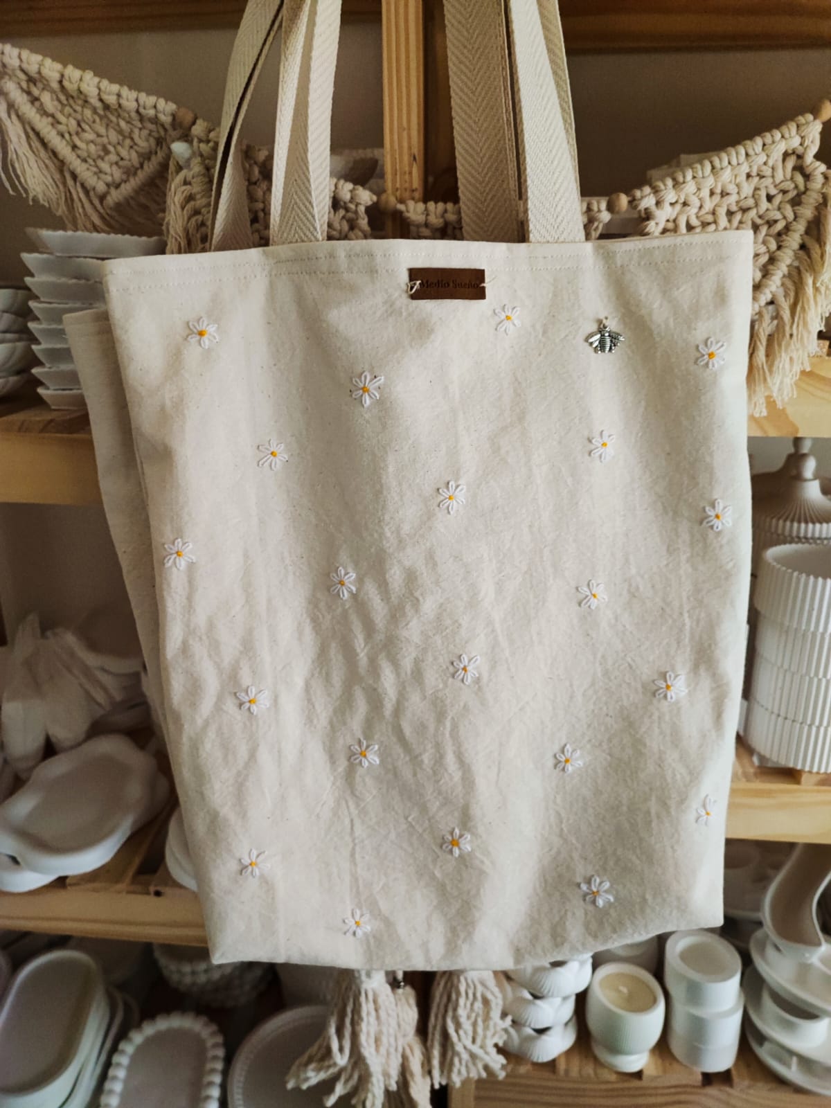 Hermoso, y no mentimos!!! hermoso y comodo bolso, realizado en tusor crudo, con bordado a mano en el frente de margaritas, pequeño detalle de dije de abejita, forro en color crudo, con base.