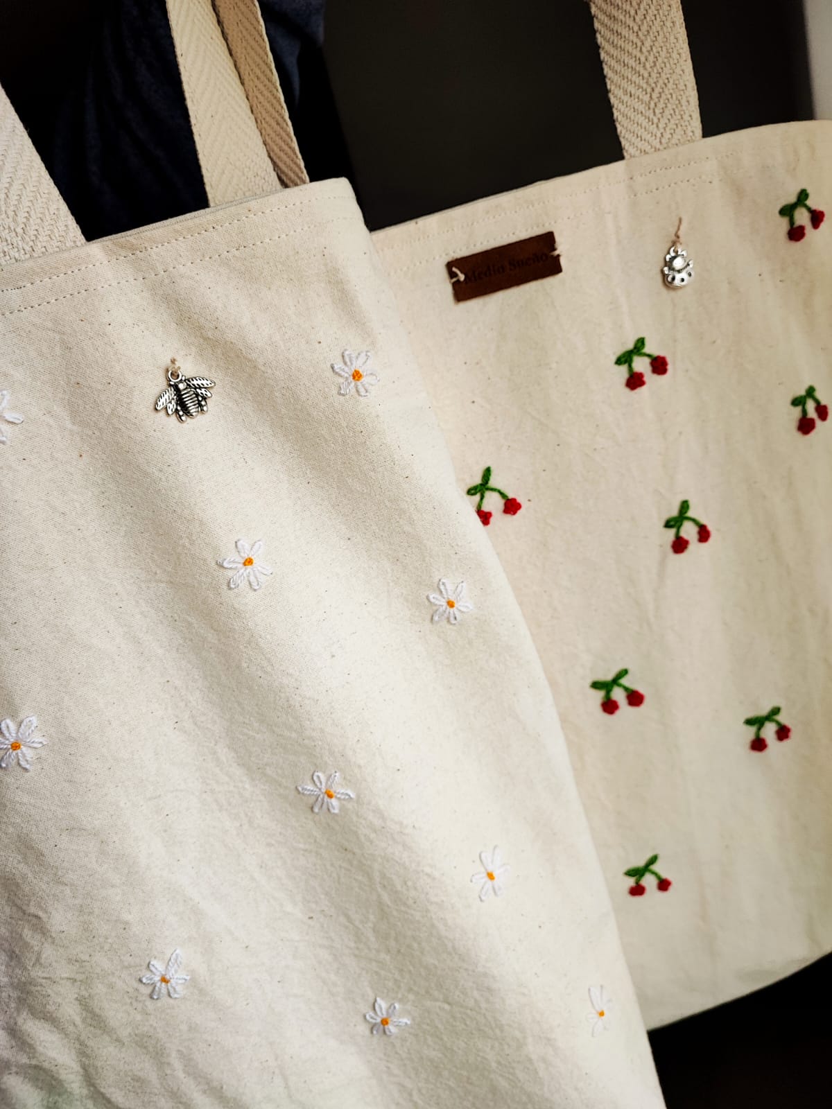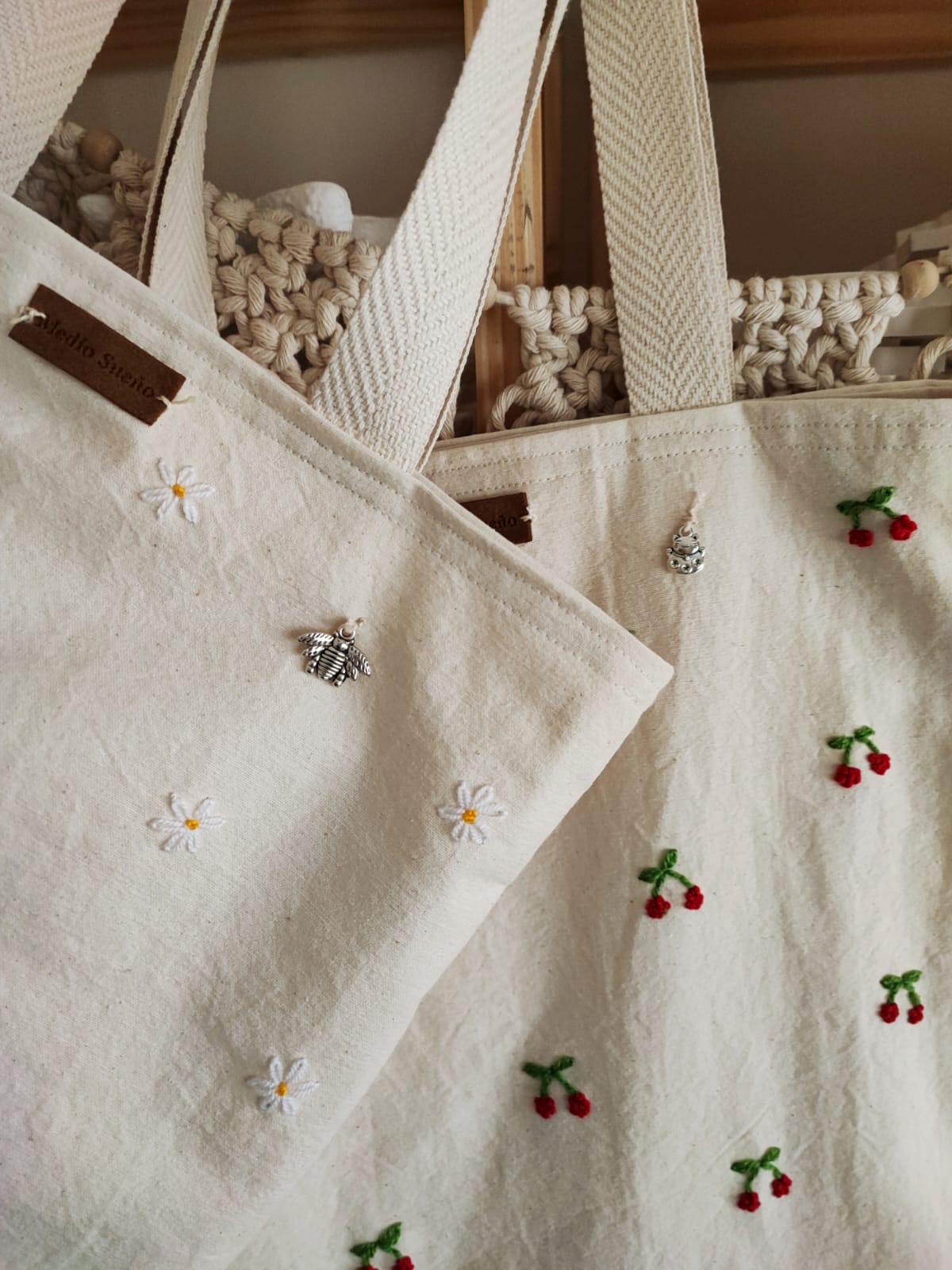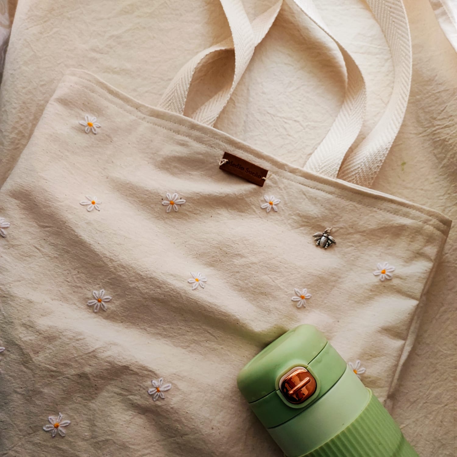Hermoso, y no mentimos!!! hermoso y comodo bolso, realizado en tusor crudo, con bordado a mano en el frente de margaritas, pequeño detalle de dije de abejita, forro en color crudo, con base.