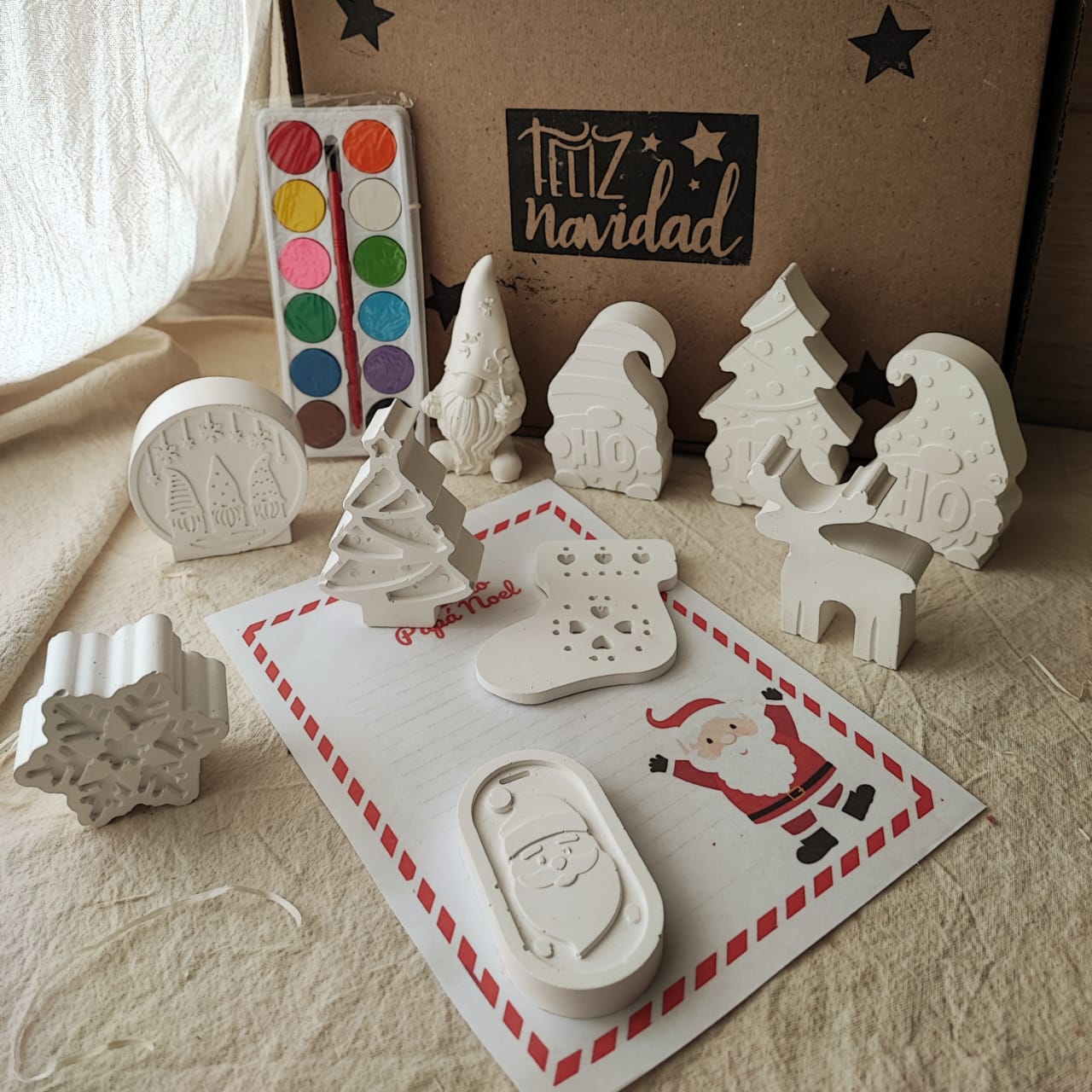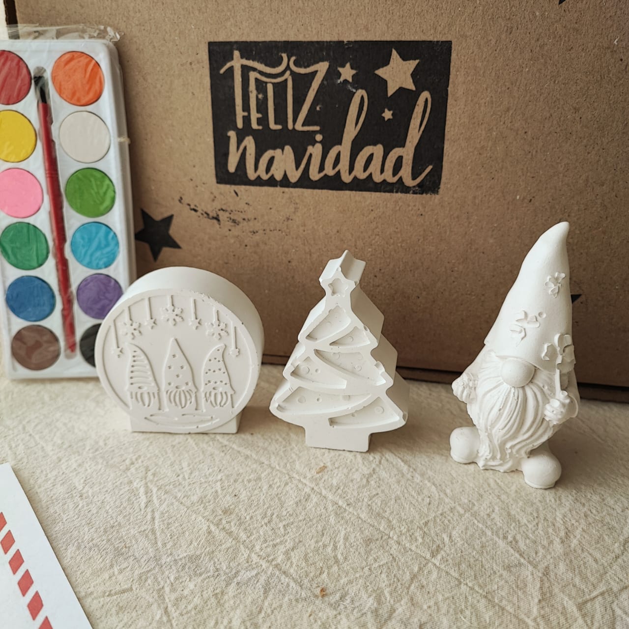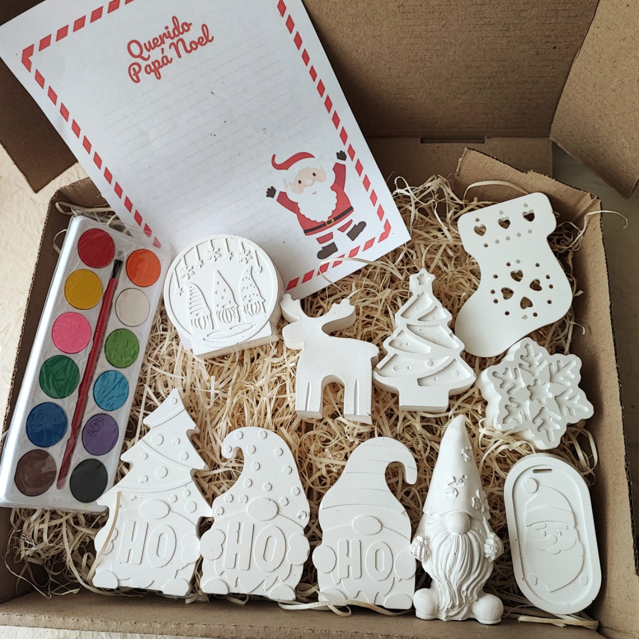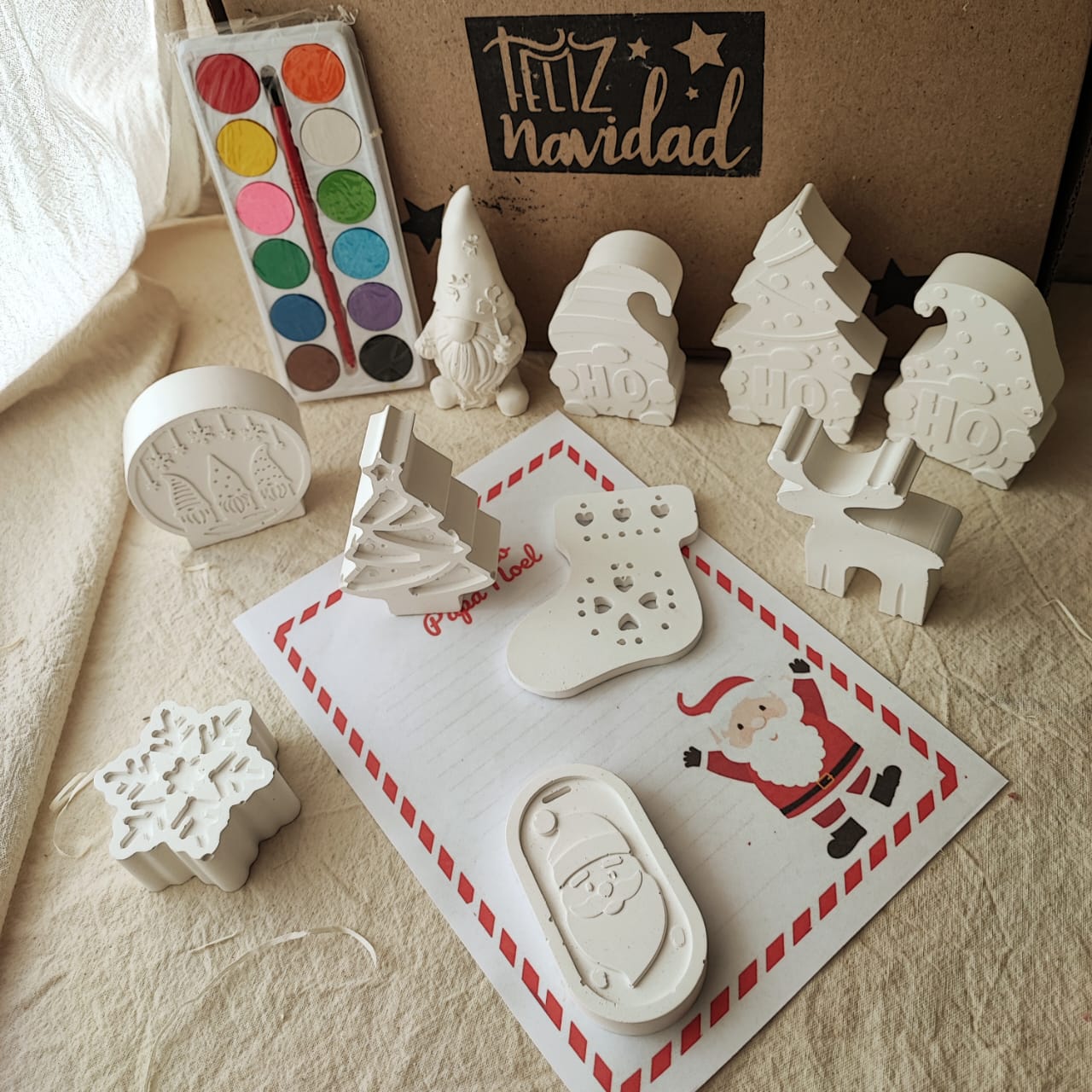 Caja navideña, ideal para que los mas pequeños puedan pintar piezas que despues decoraran la casa, el arbol, o regalar a sus familias, esta compuesta por: