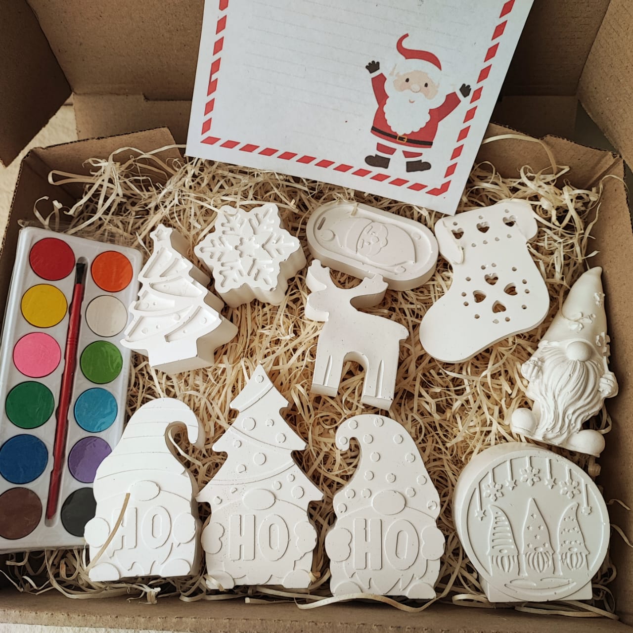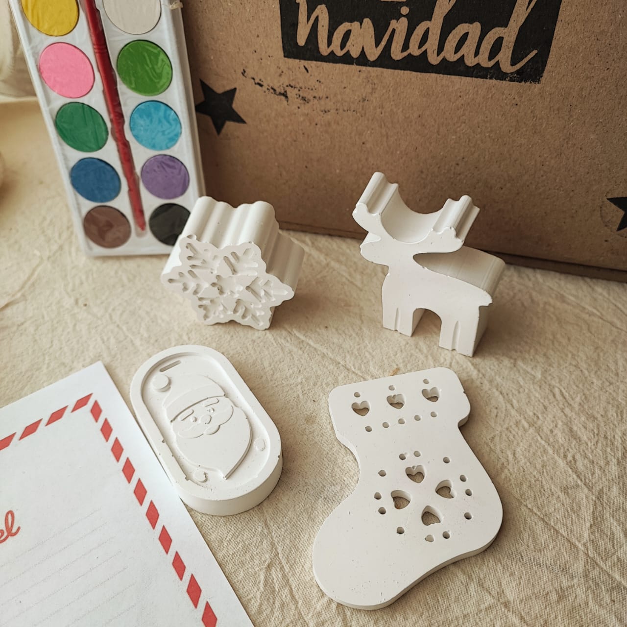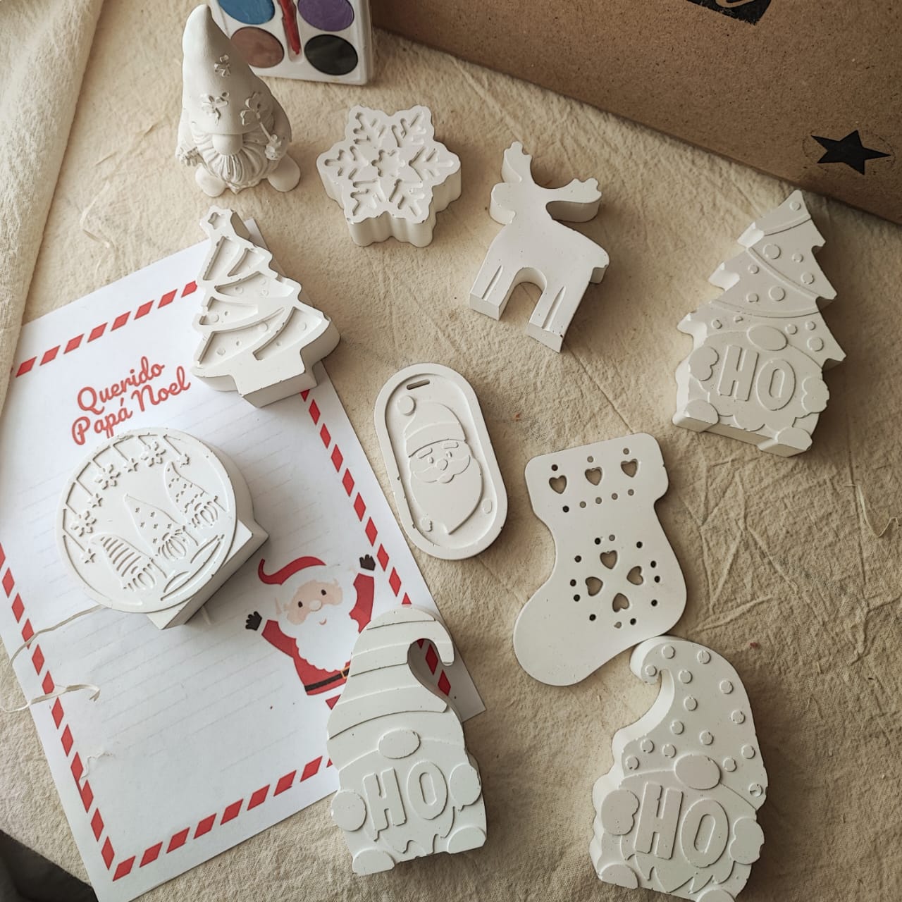 Caja navideña, ideal para que los mas pequeños puedan pintar piezas que despues decoraran la casa, el arbol, o regalar a sus familias, esta compuesta por: