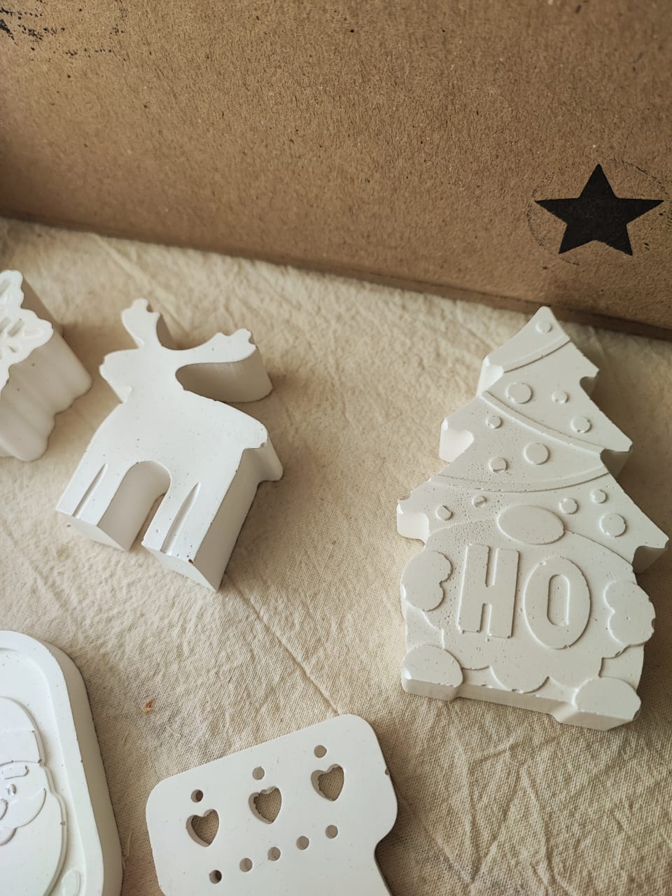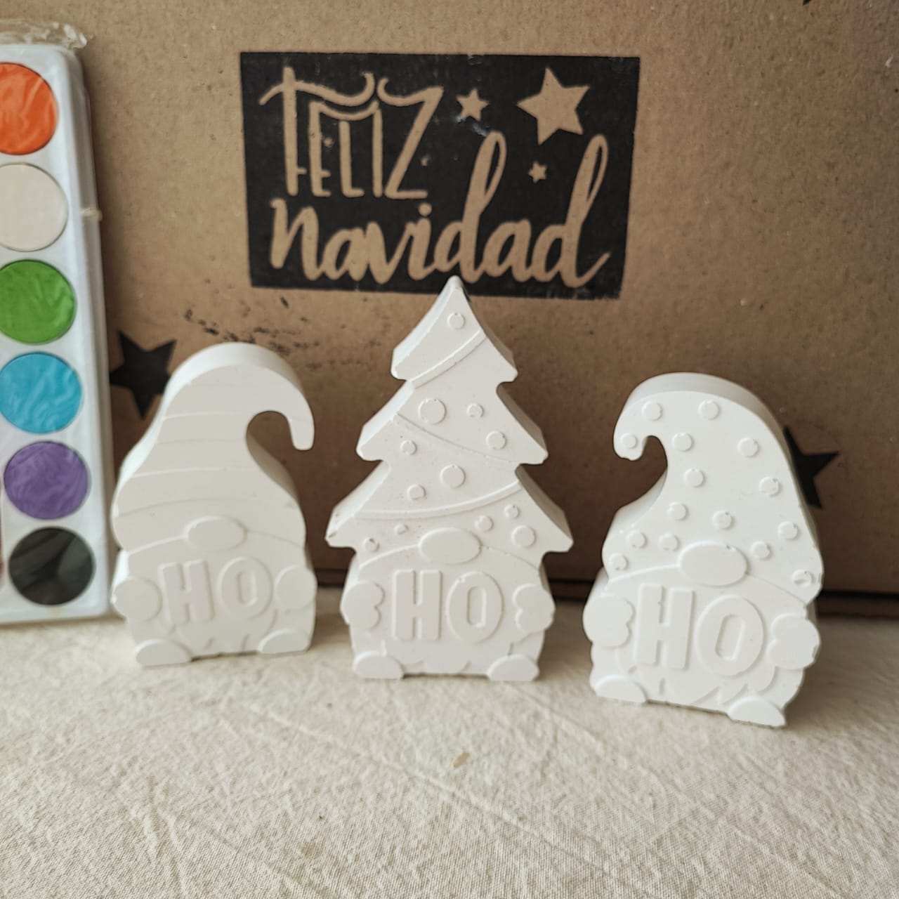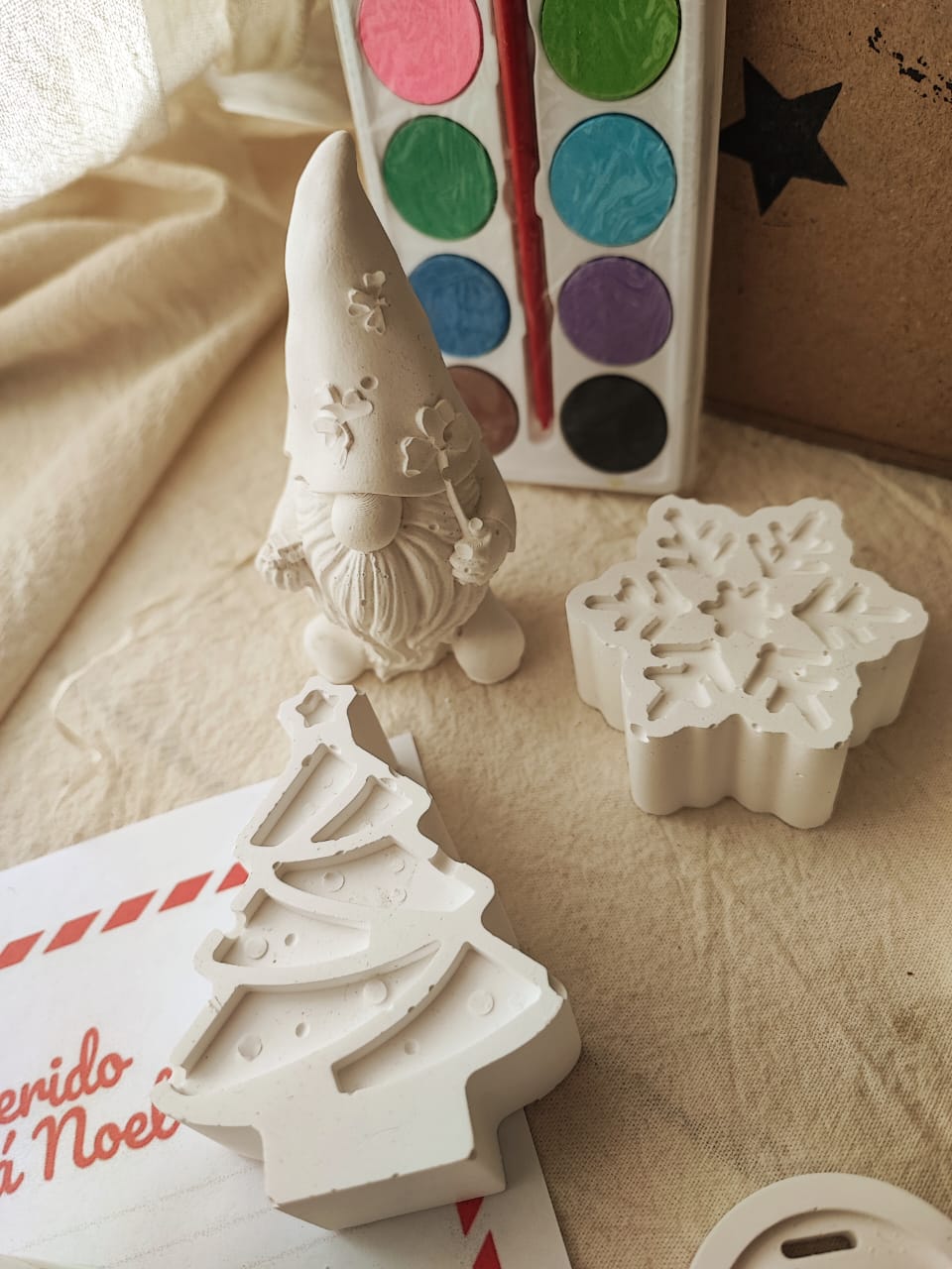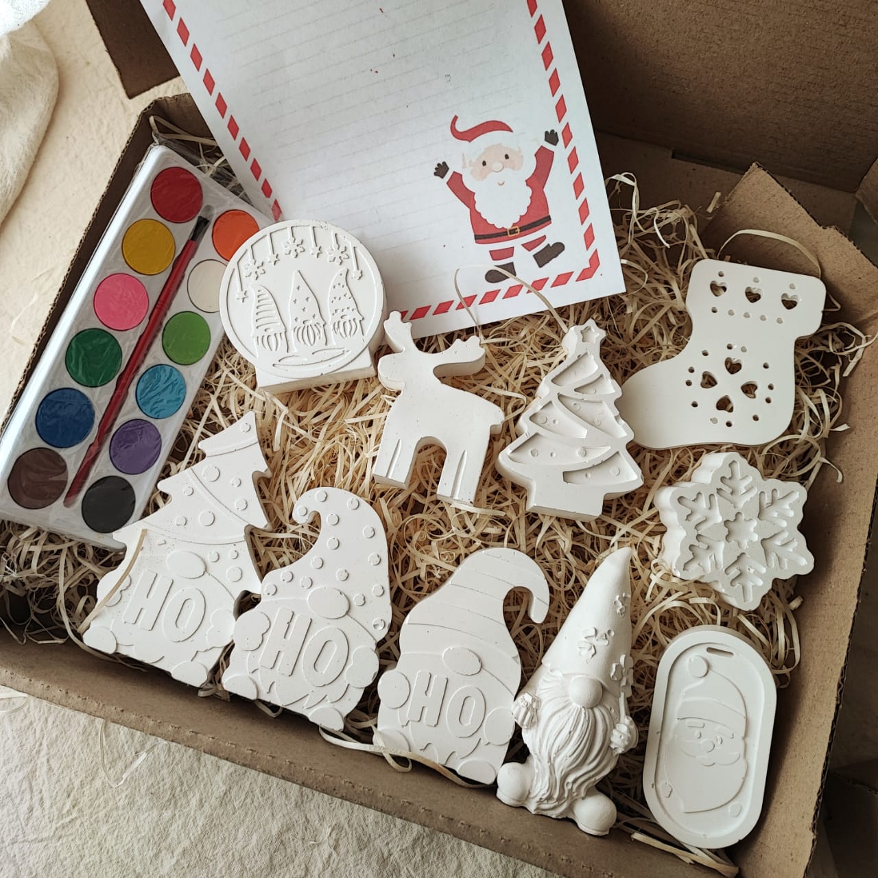 Caja navideña, ideal para que los mas pequeños puedan pintar piezas que despues decoraran la casa, el arbol, o regalar a sus familias, esta compuesta por: