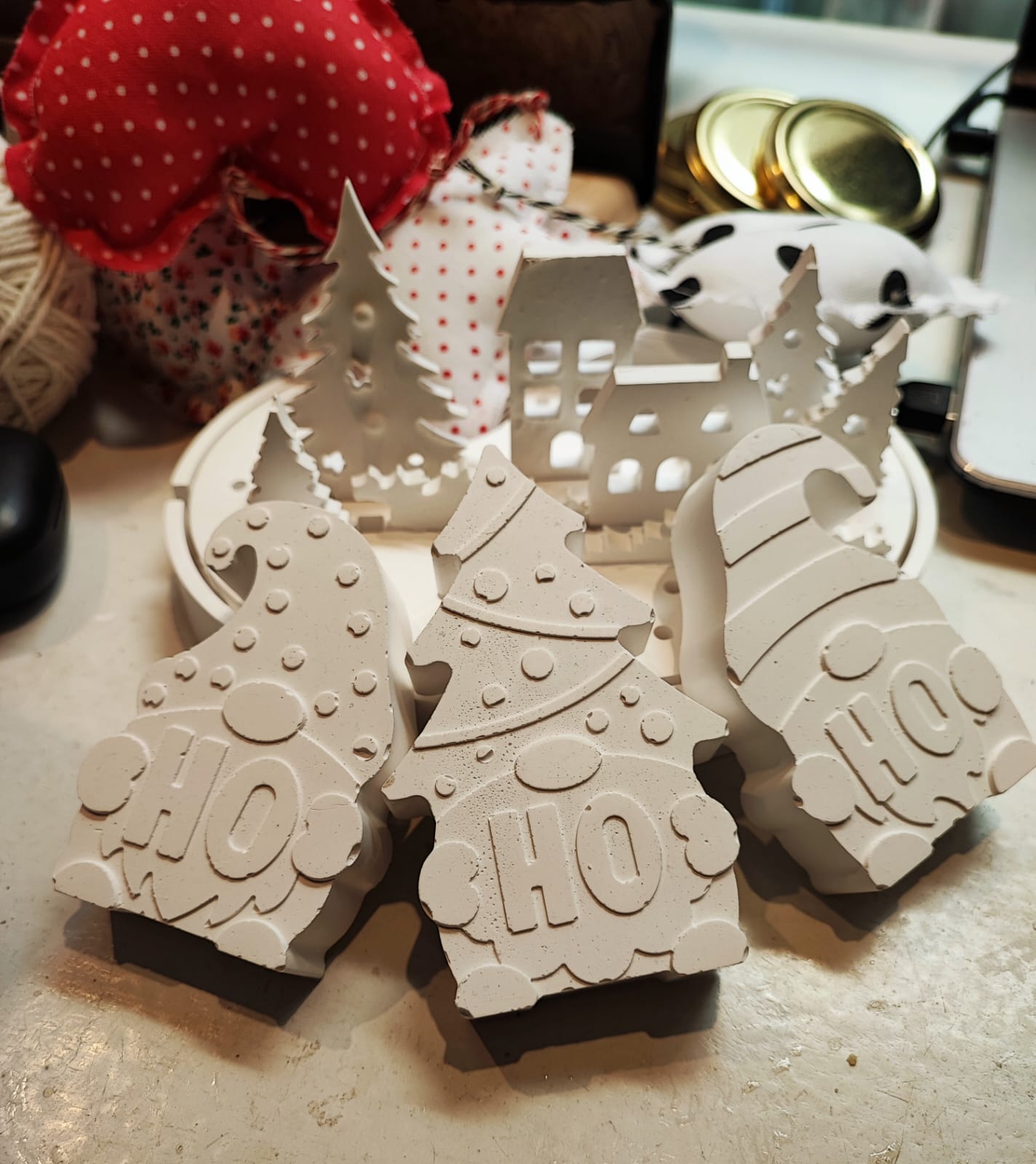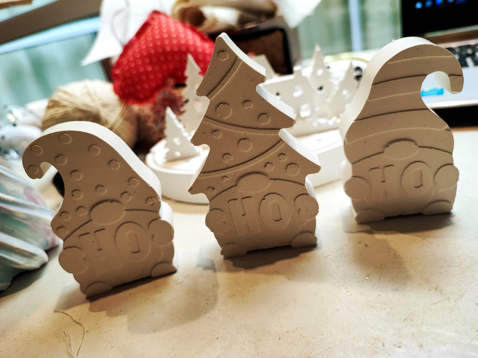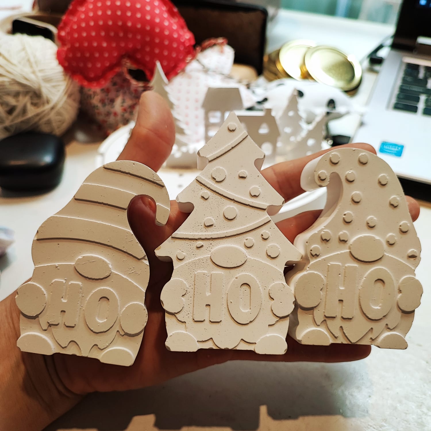 Trio de figuras decorativas HO HO HO en yeso ceramico blanco: medida, 10 cm de alto. el pino y 8cm de alto los duendes.