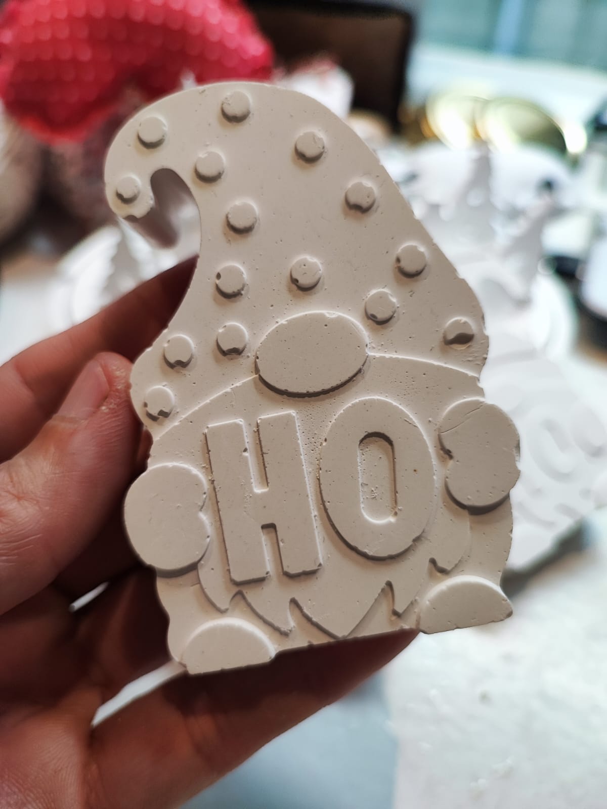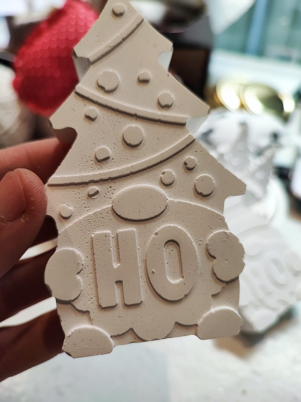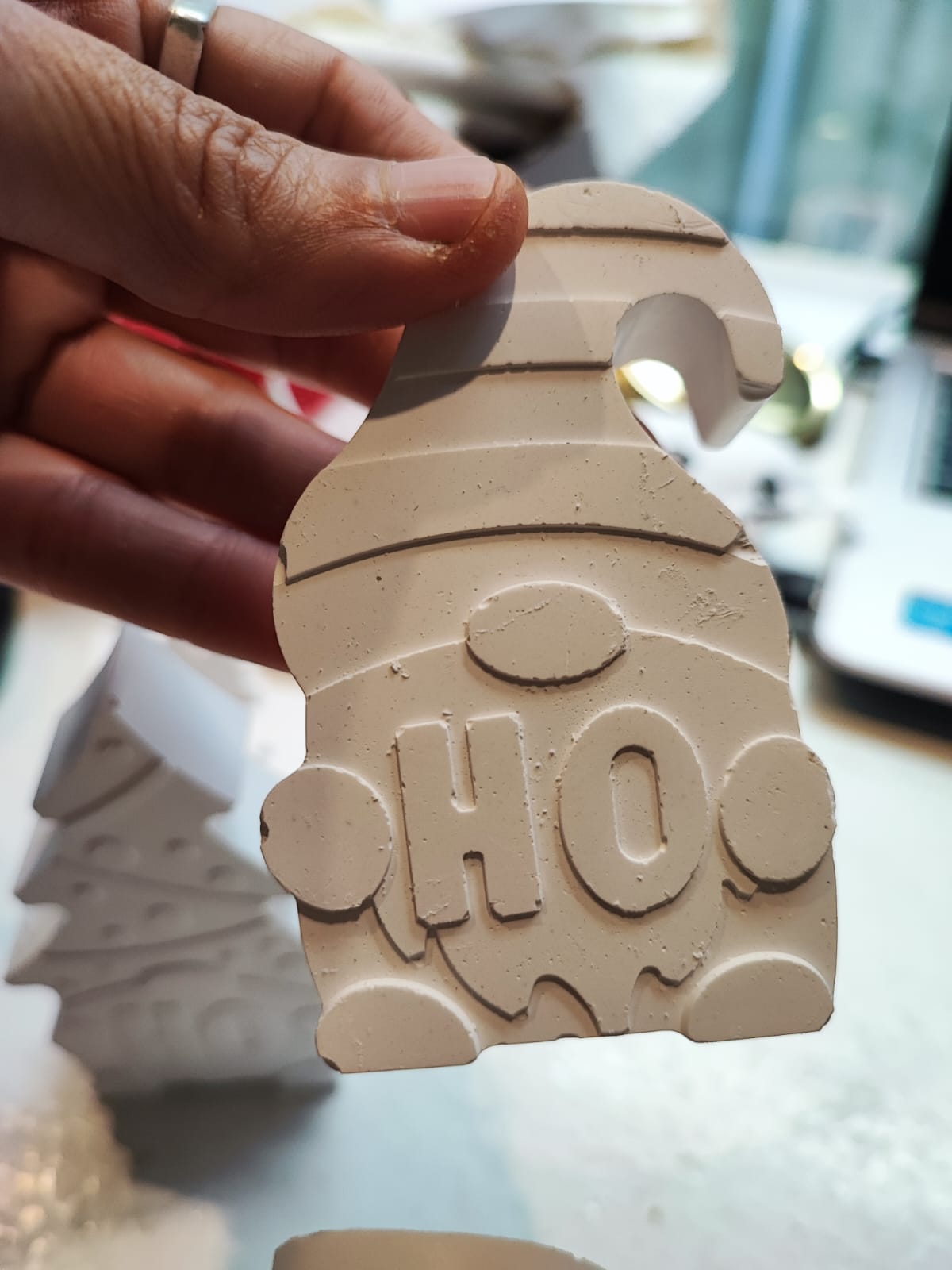 Trio de figuras decorativas HO HO HO en yeso ceramico blanco: medida, 10 cm de alto. el pino y 8cm de alto los duendes.