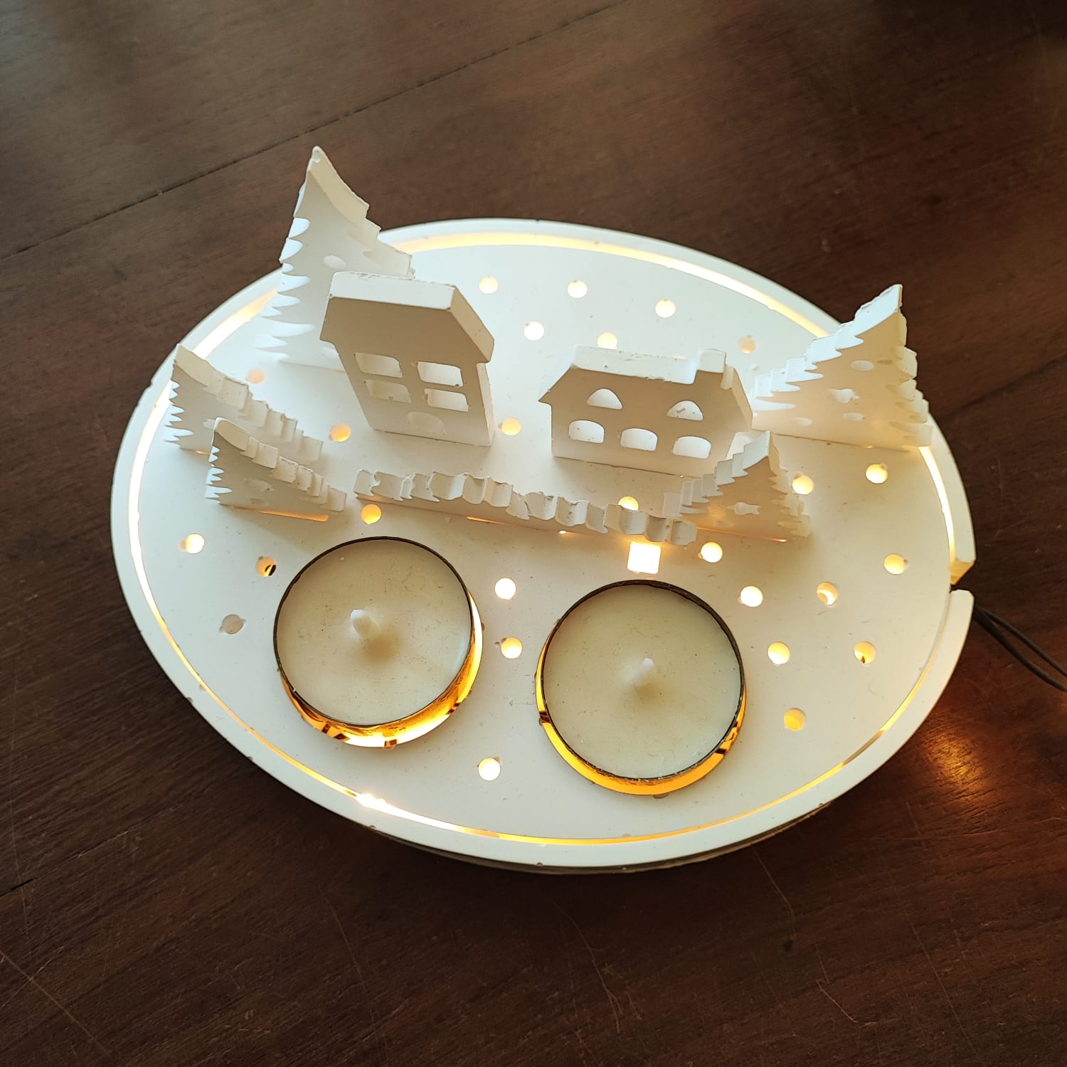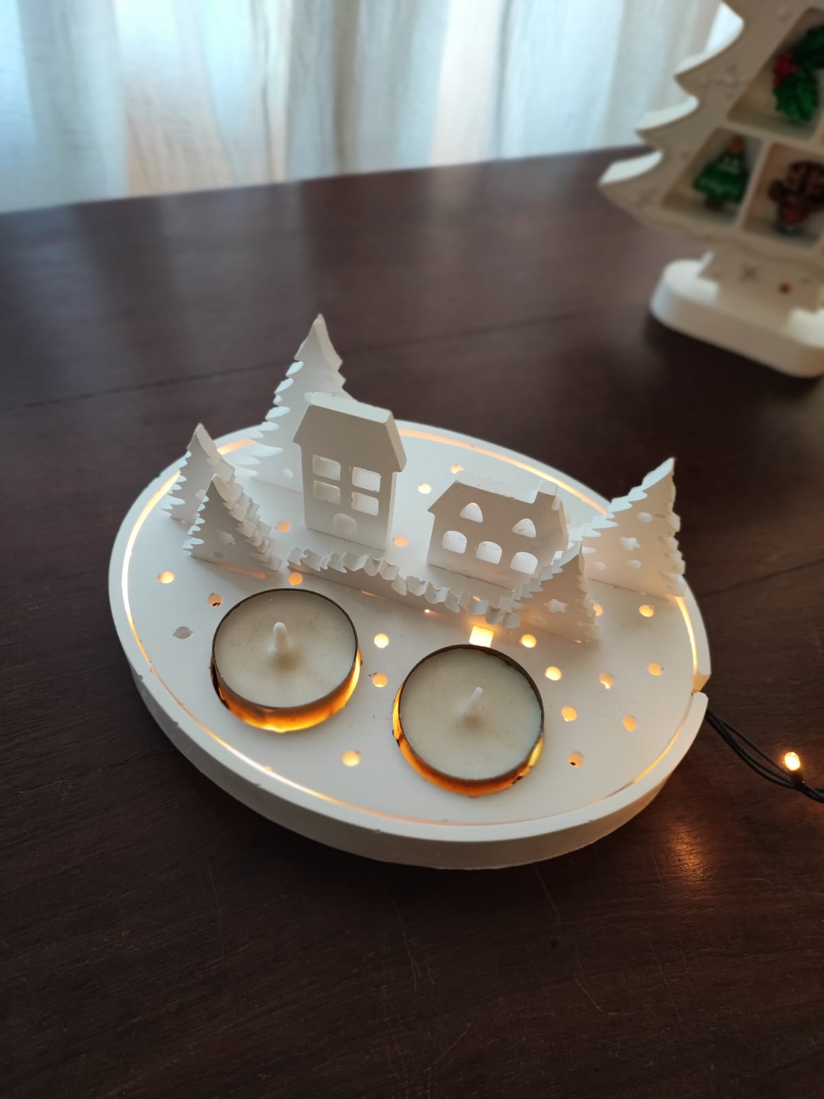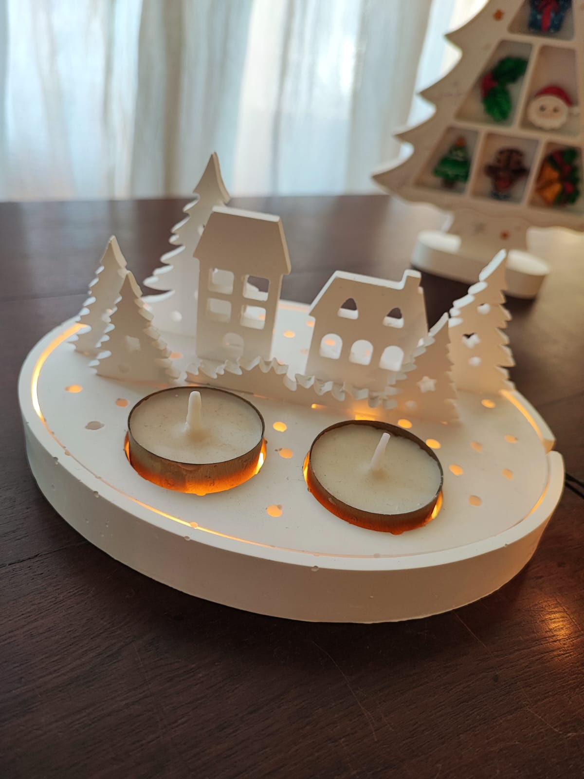 Increible paisaje navideño, consta de dos partes + 8 piezas encastrables. Casa, pinos y cesped. Tiene espacio para dos velas de noche, y se le puede agregar luces.