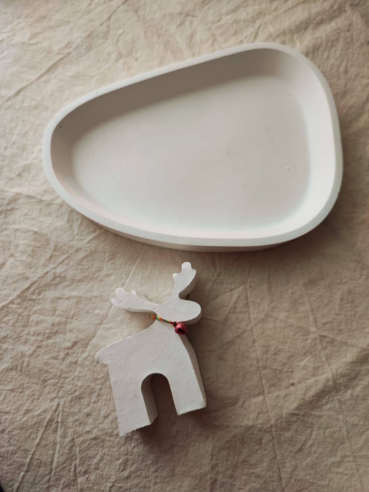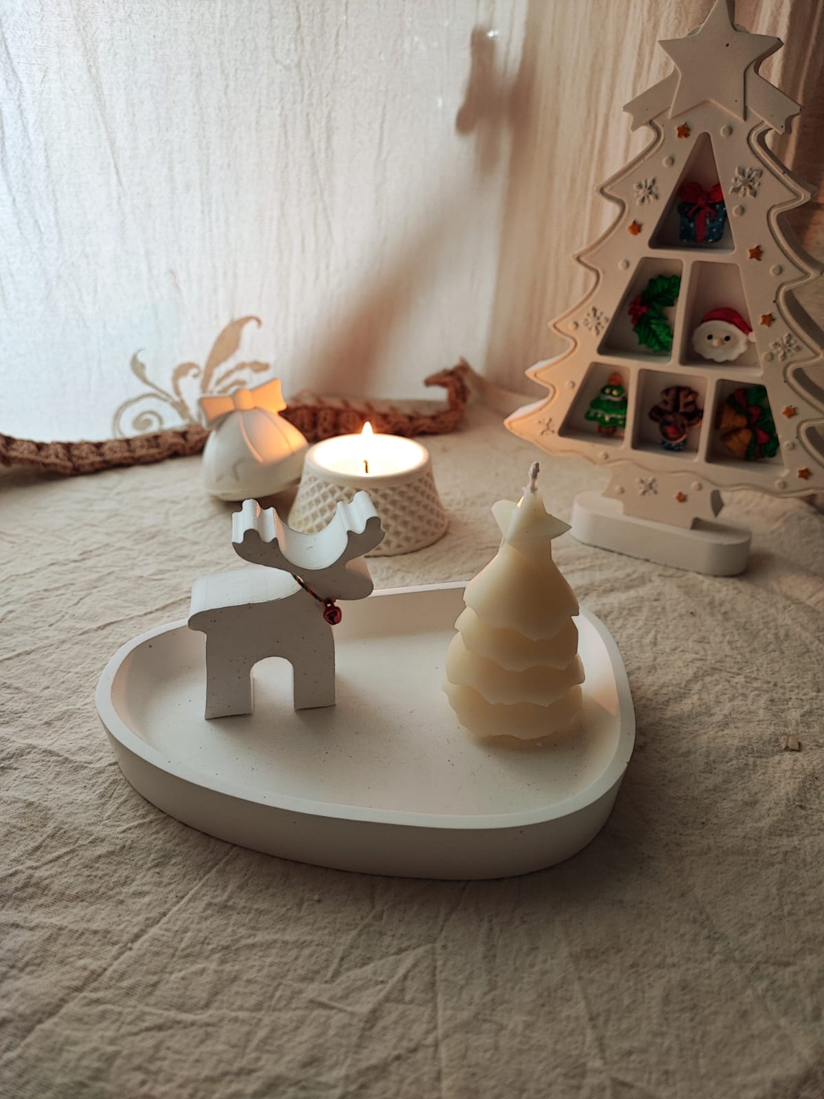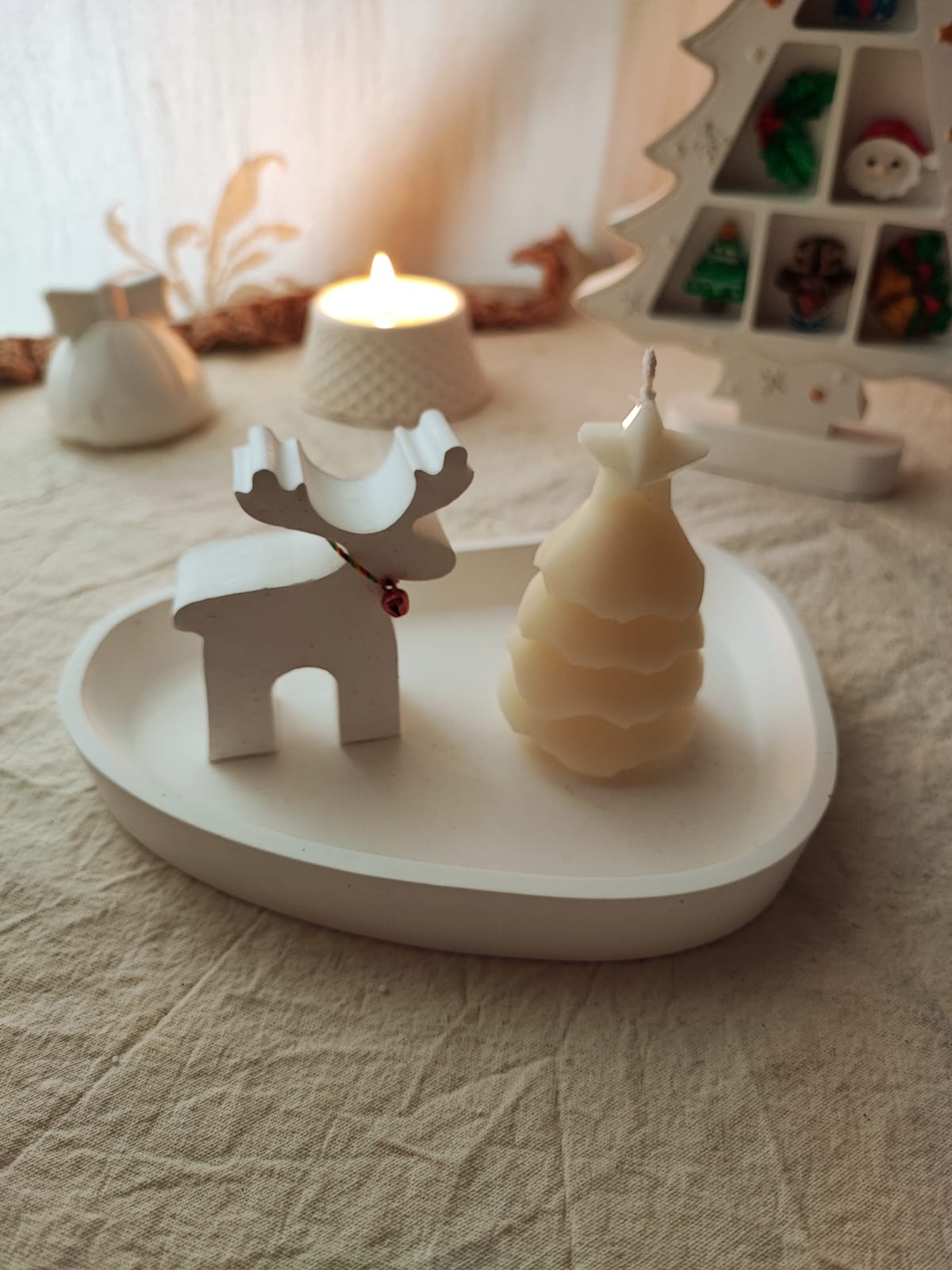 Bonito set compuesto por 1 bandeja triangular mediana con borde alto, una figura decorativa de reno chico con cascabelito y una vela pino. LEER CON ATENCION: