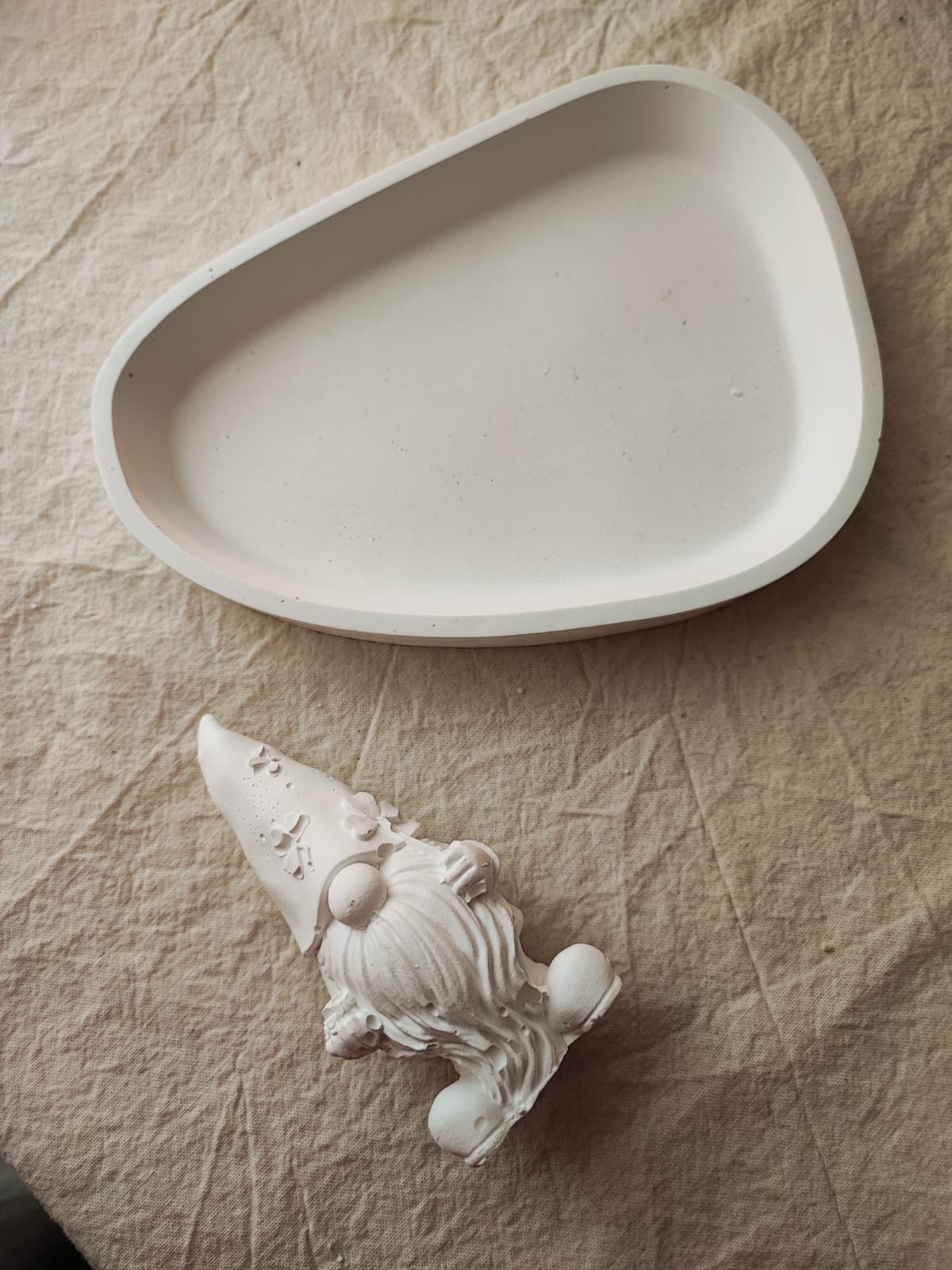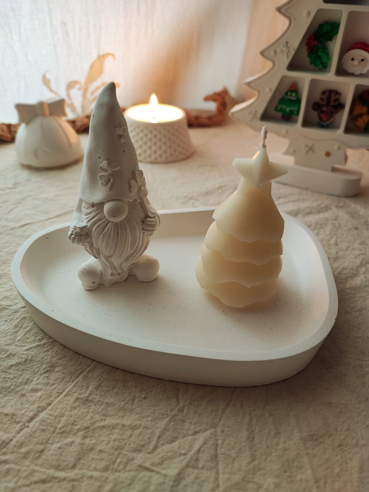 Bonito set compuesto por 1 bandeja triangular mediana con borde alto, una figura decorativa de duende y una vela pino. LEER CON ATENCION: