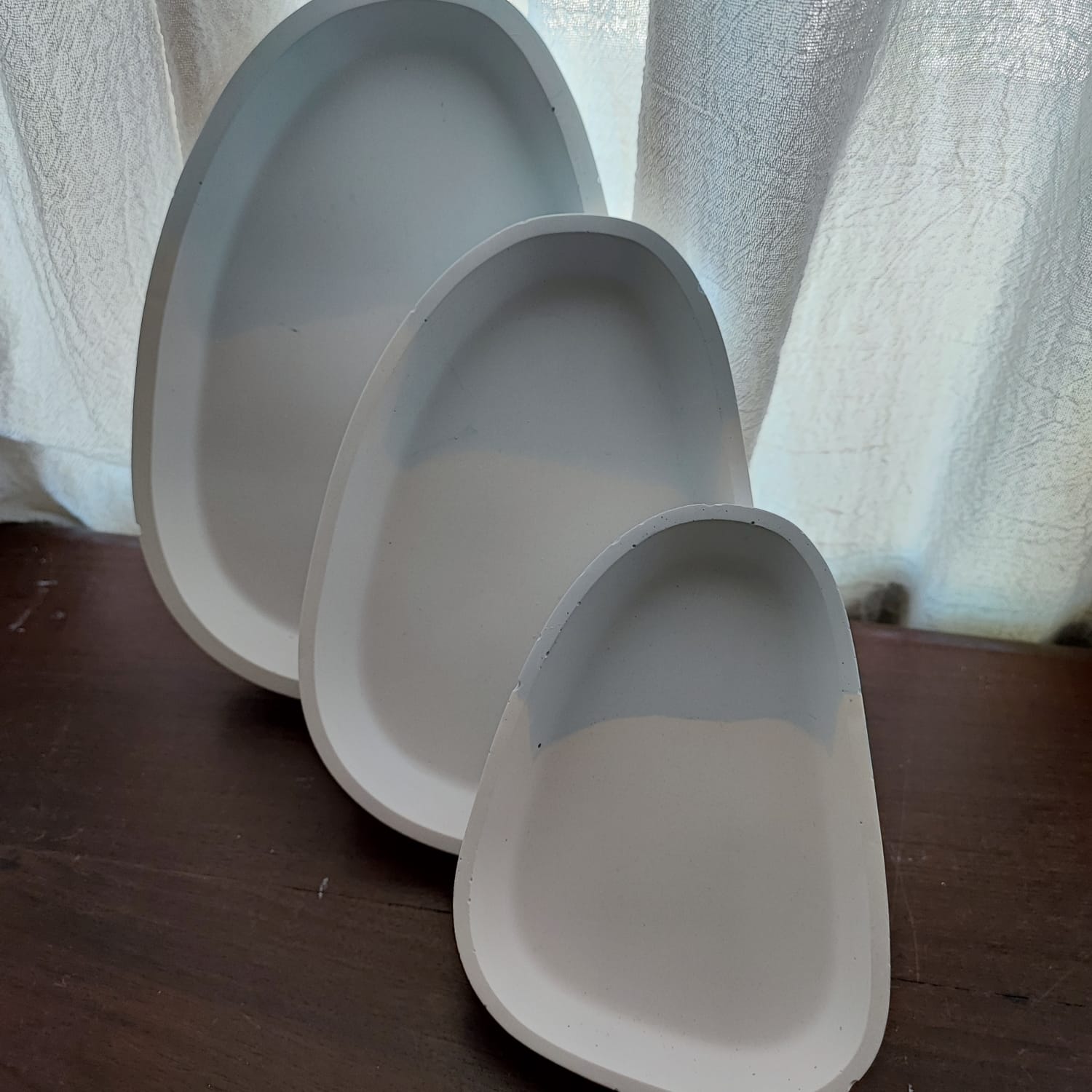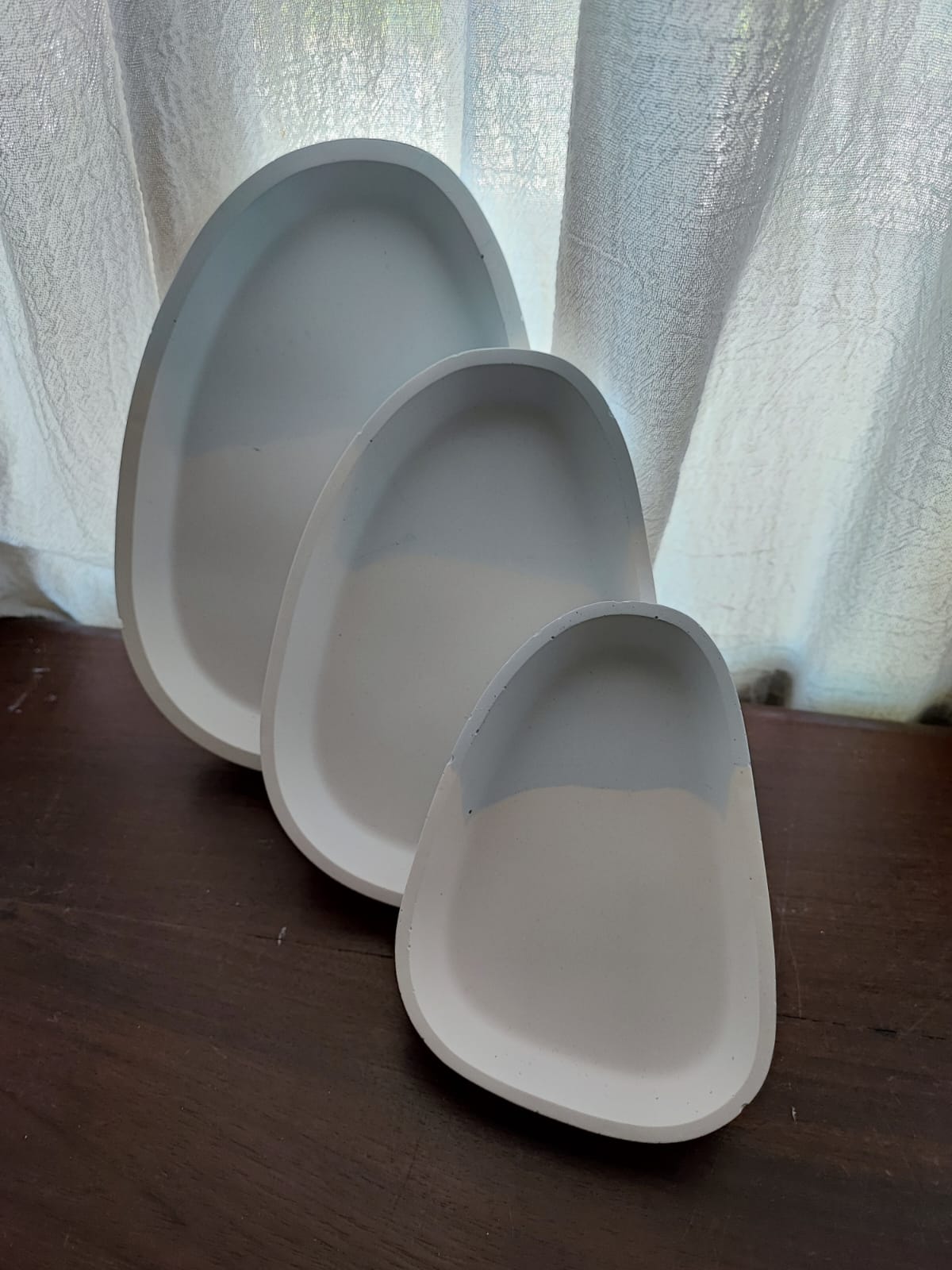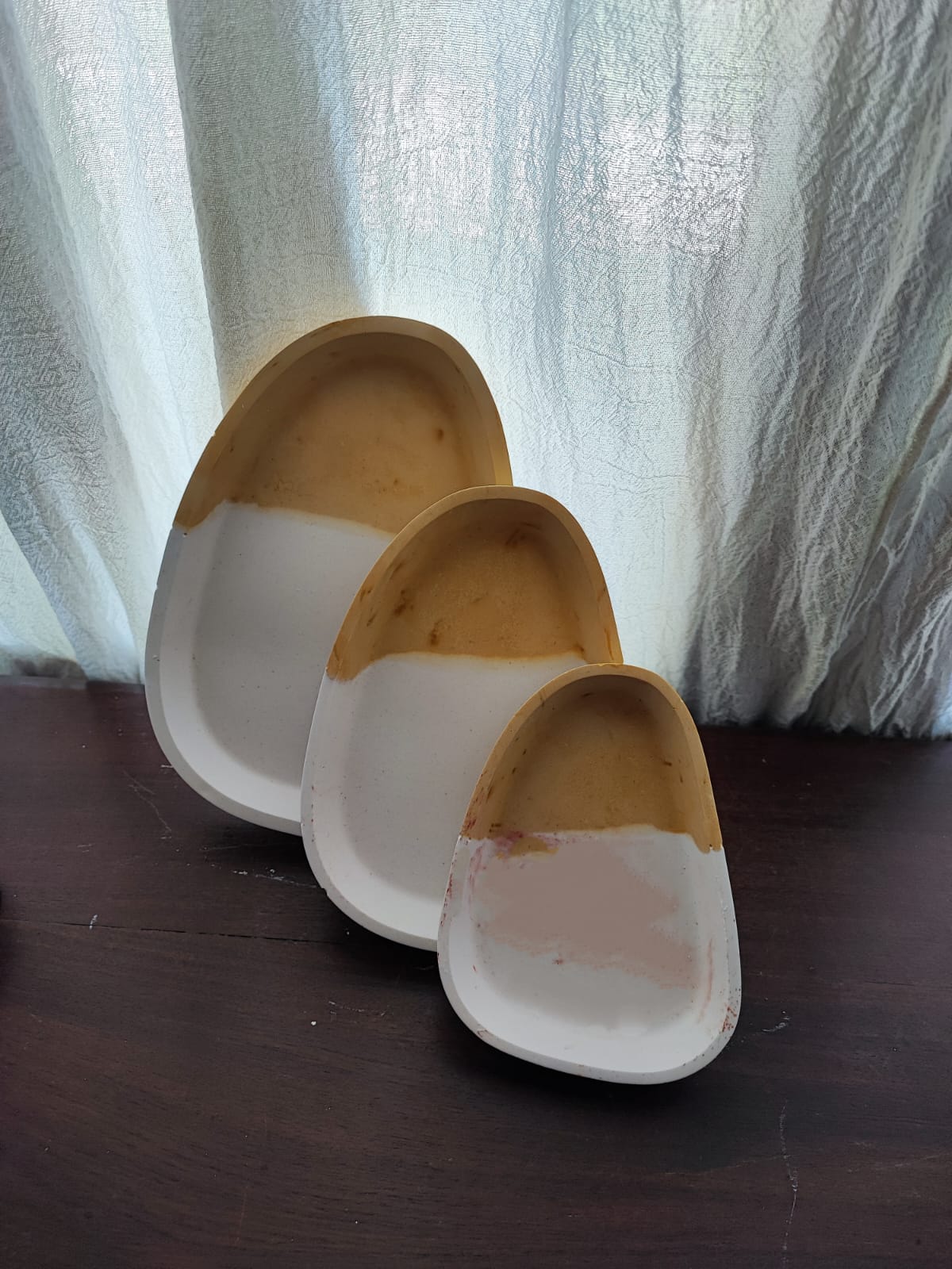 Trio de las hermosas bandejas triangulares en yeso ceramico, con profundidad, blancas combinadas. Incluye
