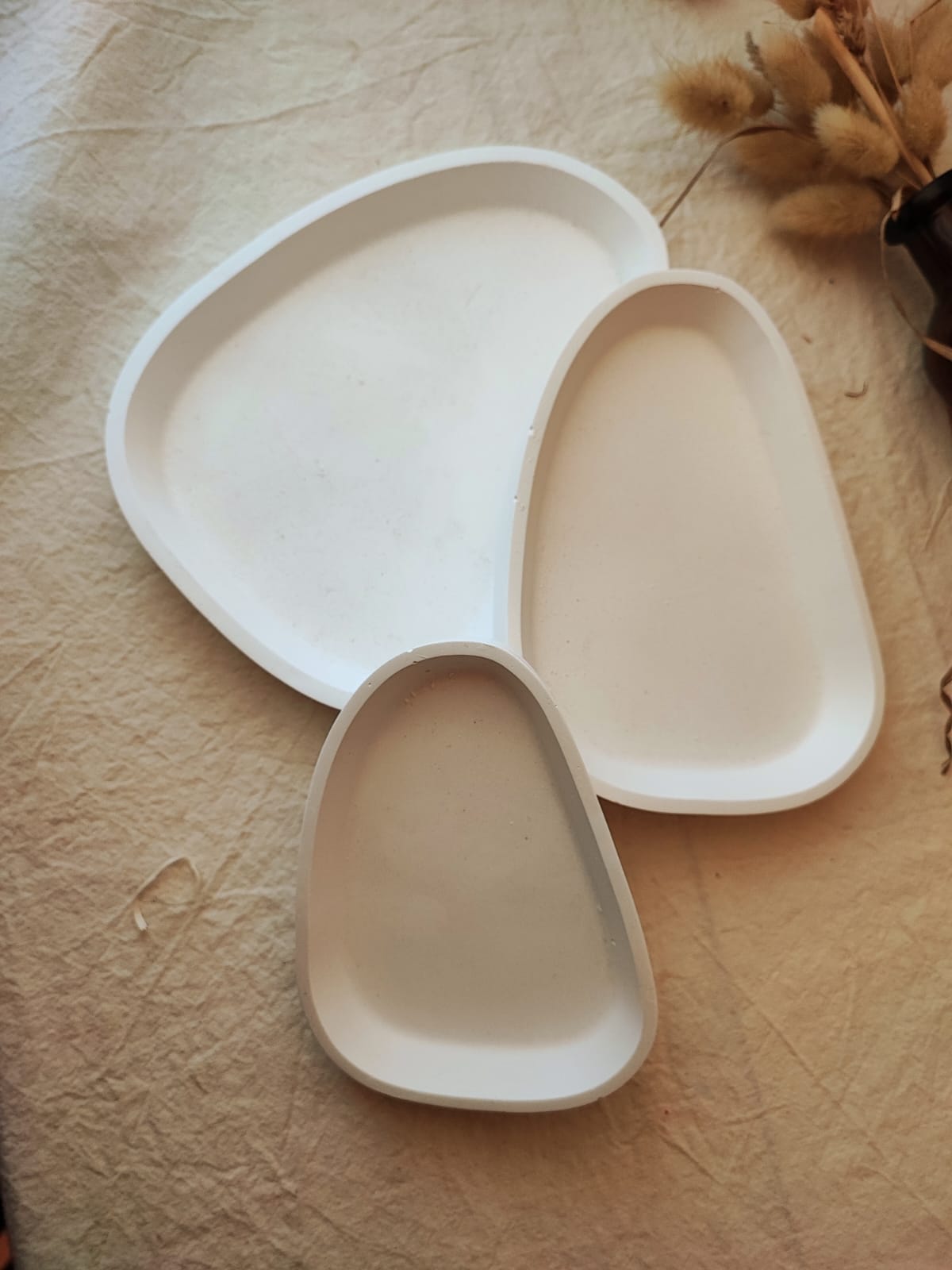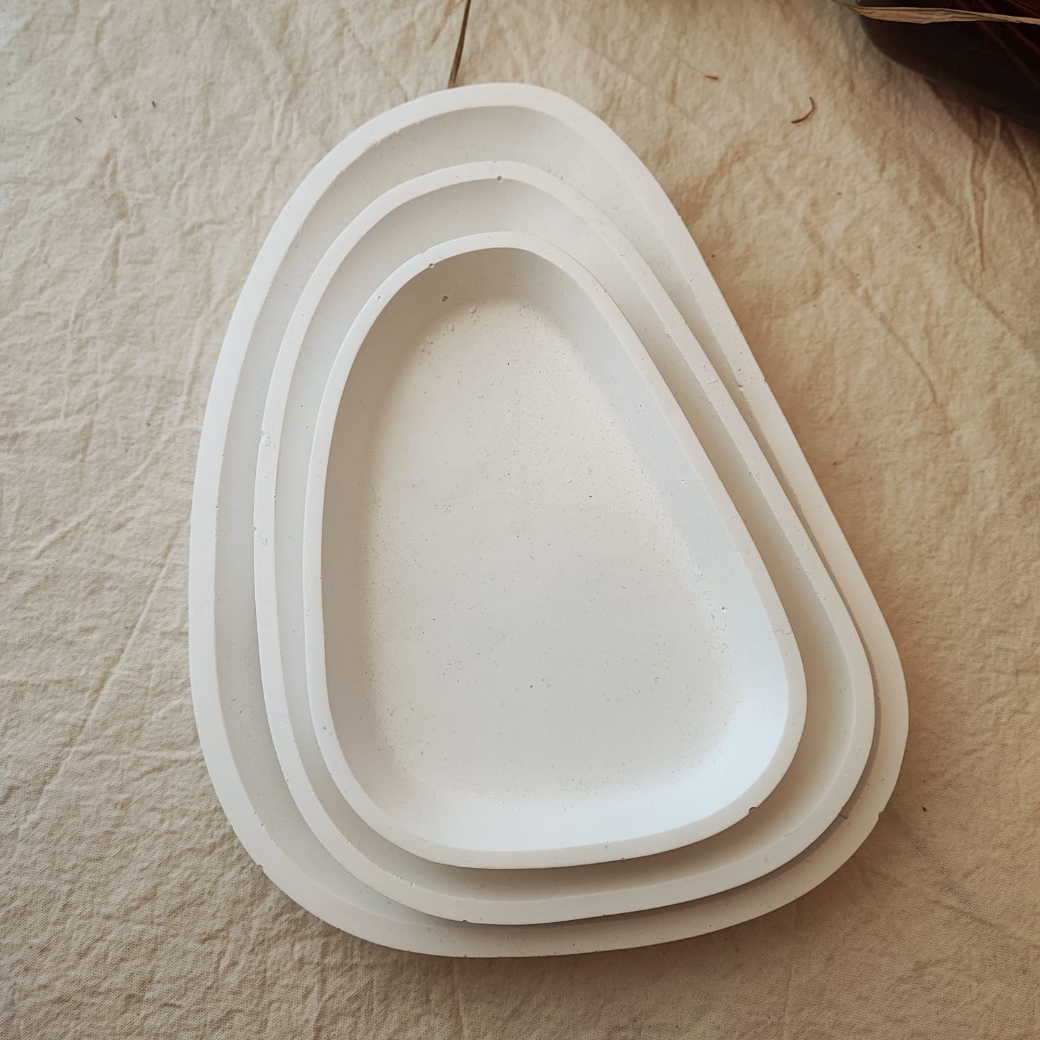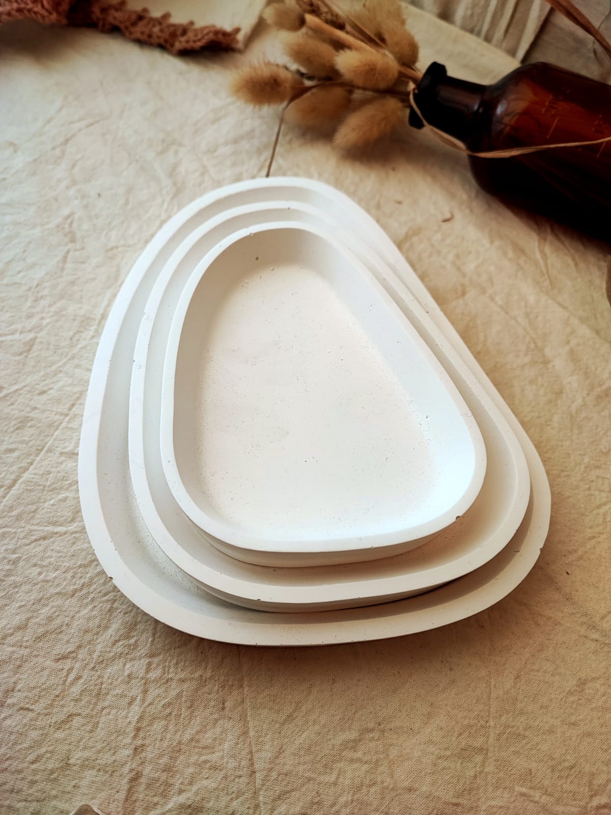 Trio de las hermosas bandejas triangulares, con profundidad, en yeso ceramico blanco, sin color. Incluye