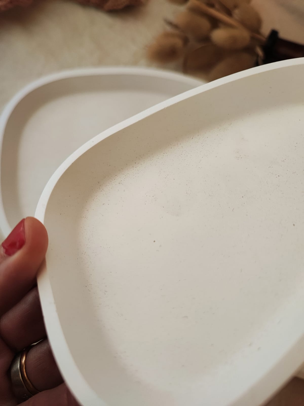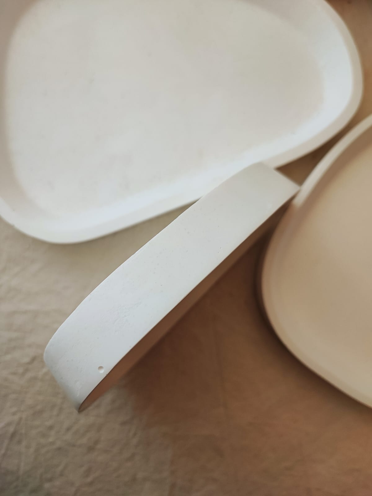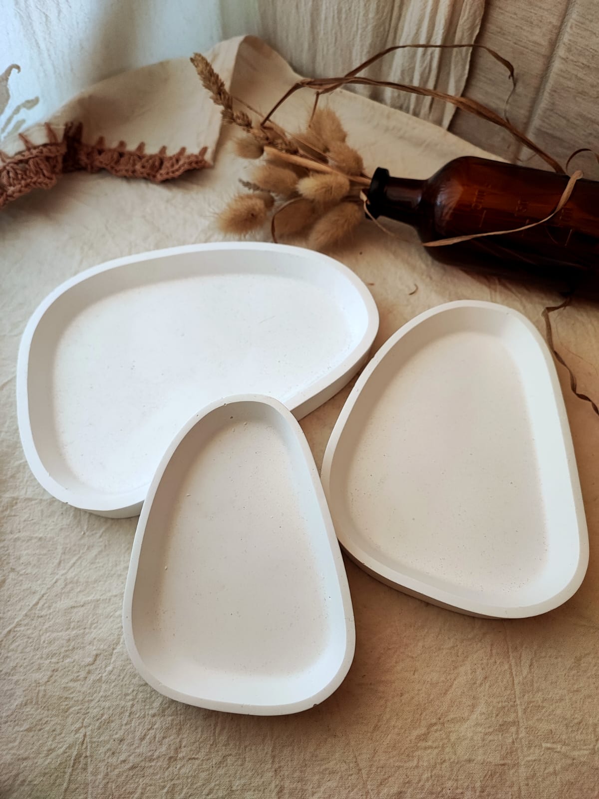 Trio de las hermosas bandejas triangulares, con profundidad, en yeso ceramico blanco, sin color. Incluye