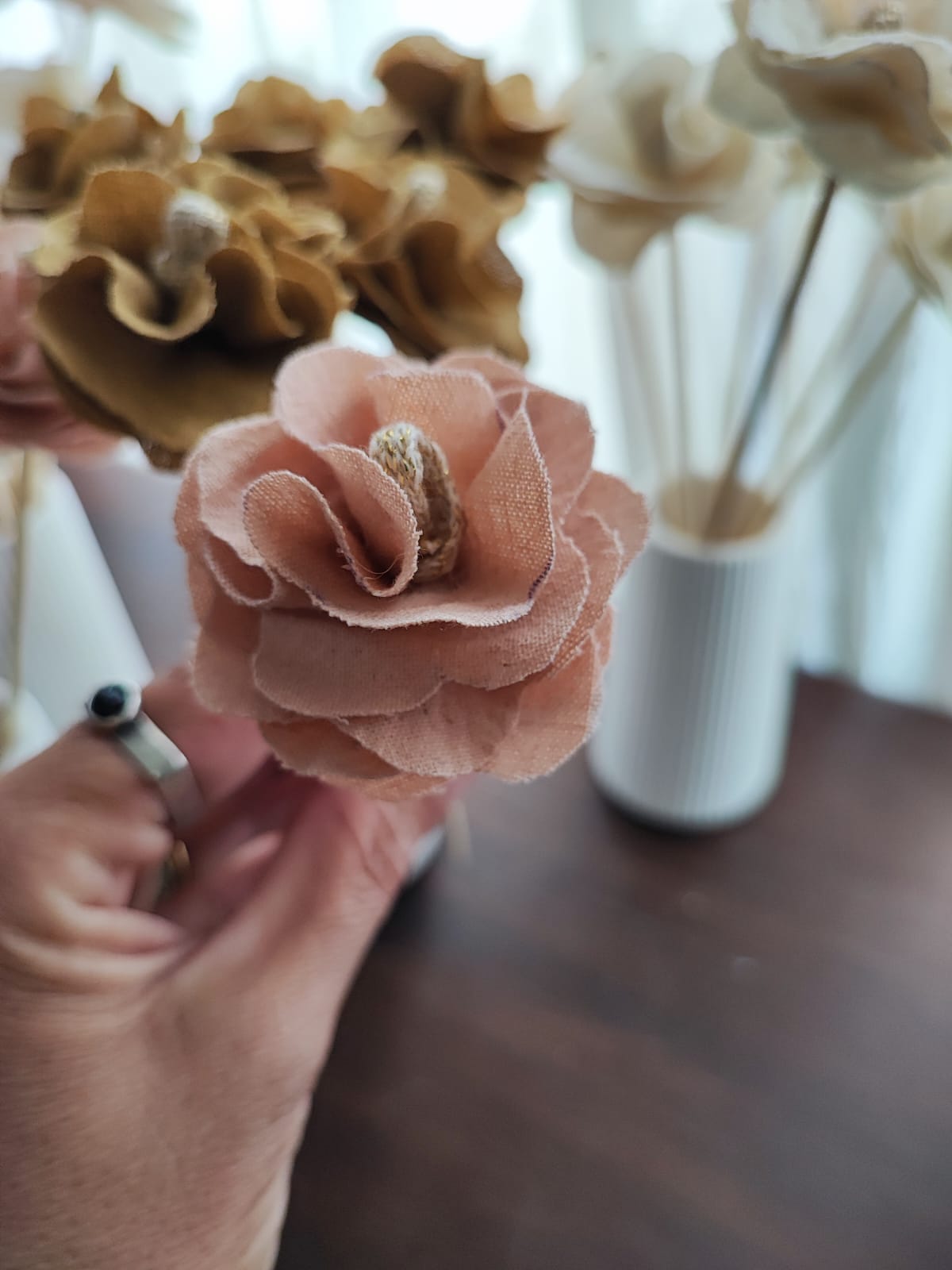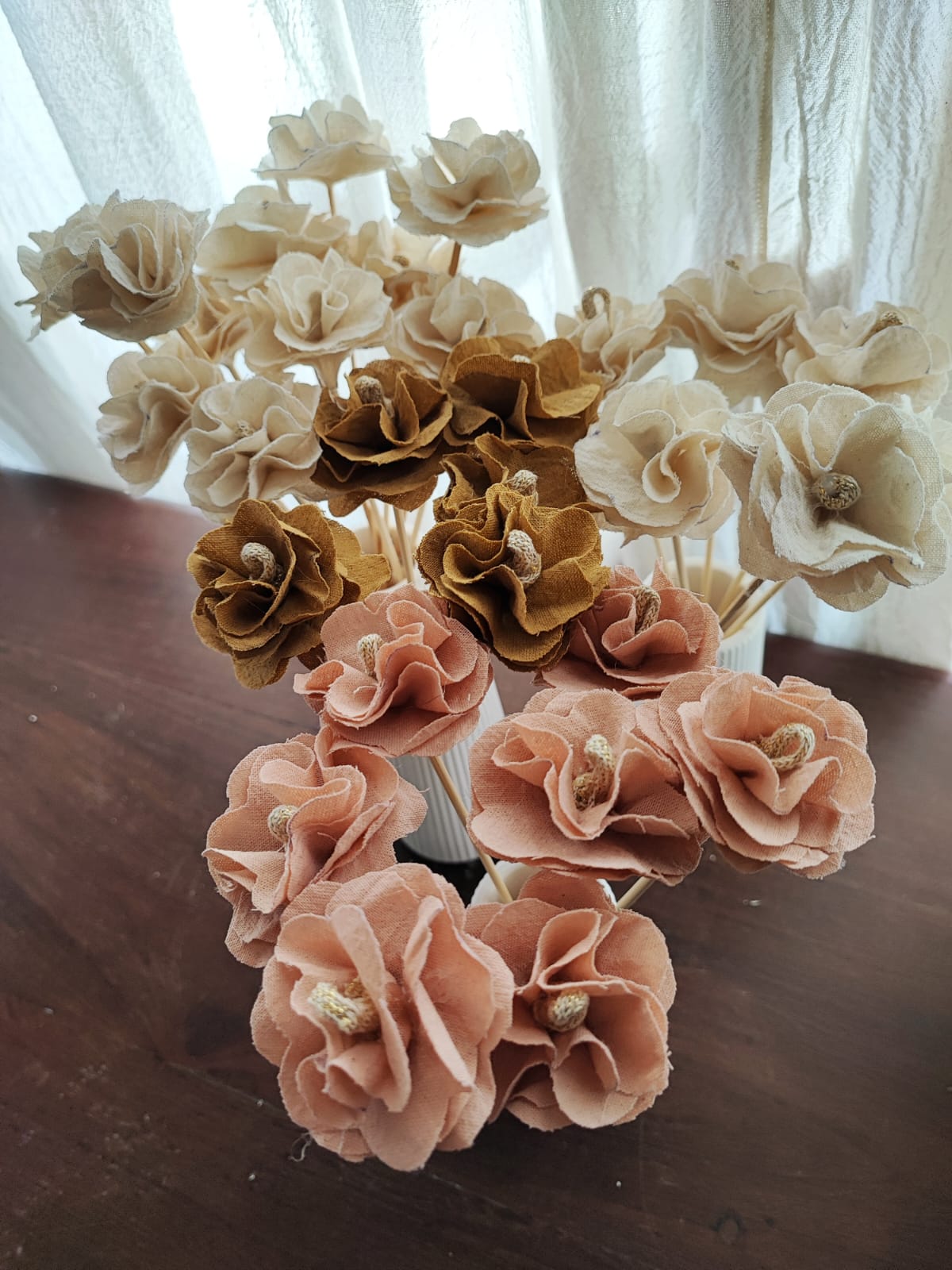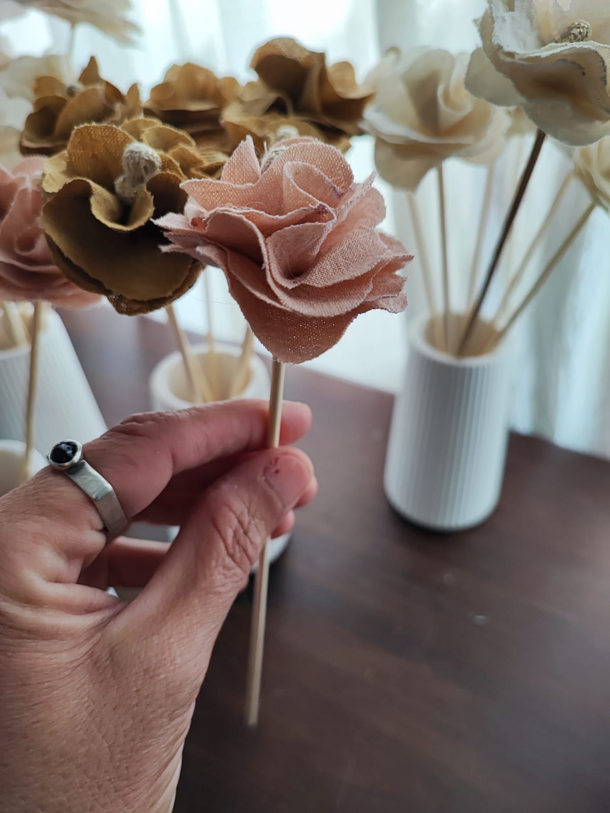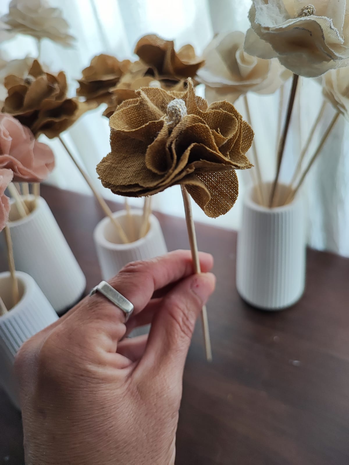 Hermosas flores en tela. Precio individual. El precio de publicaciòn es por una flor. alto aproximado del palillo 18cm.