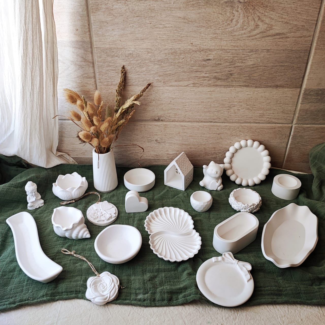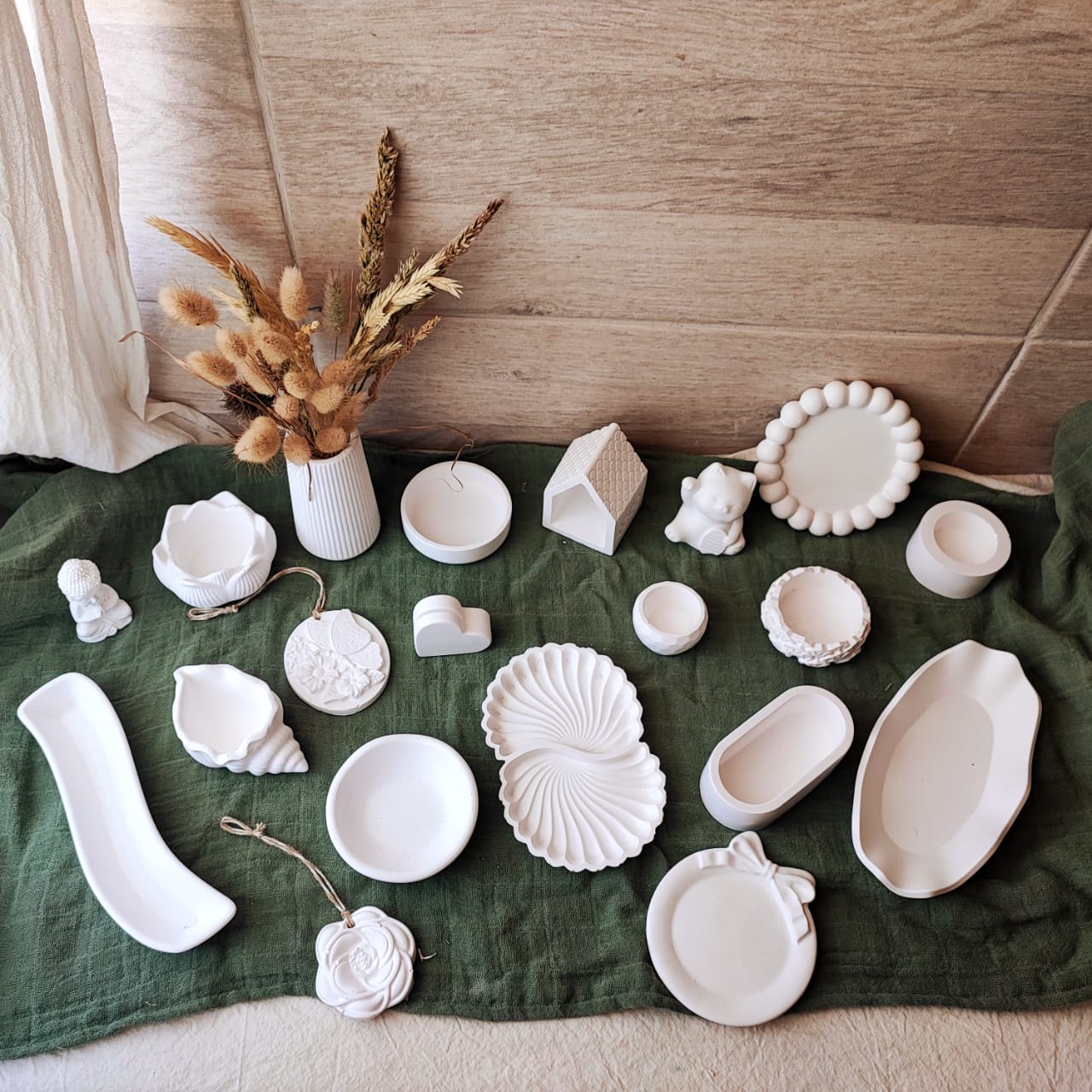 Combo en yeso ceramico, blanco, en crudo; consta de 60 piezas, 20 modelos diferentes. Vas a encontrar bandejitas, posavasos, floreros, cuencos, figuras decorativas, tarjeteros/fotos y aromatizadores.