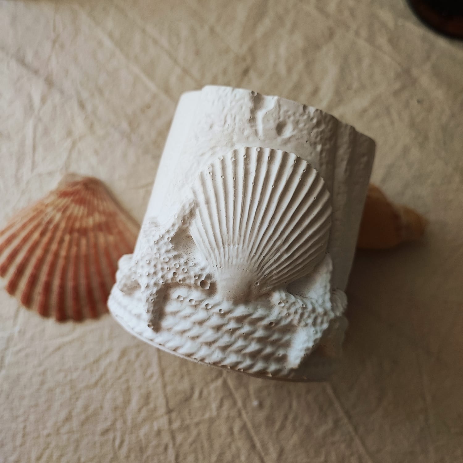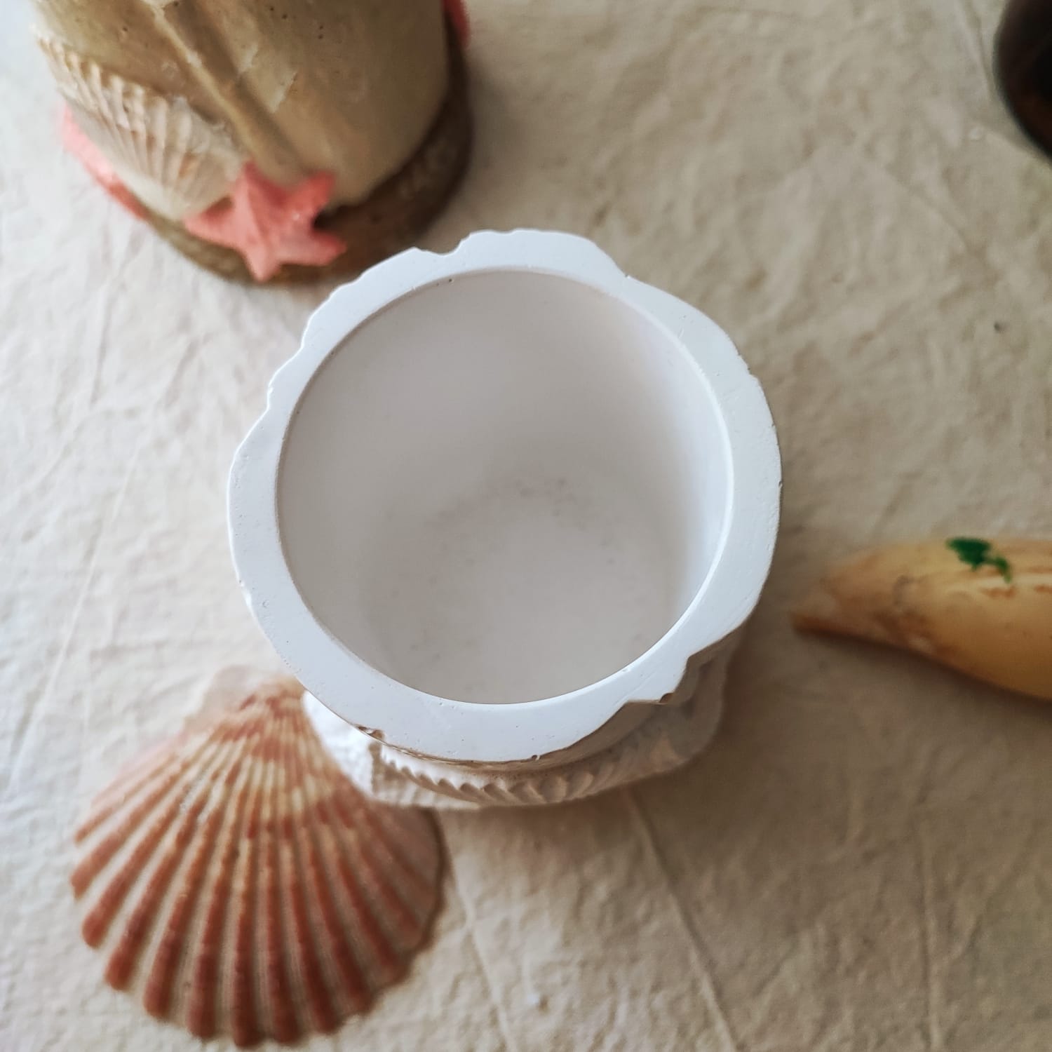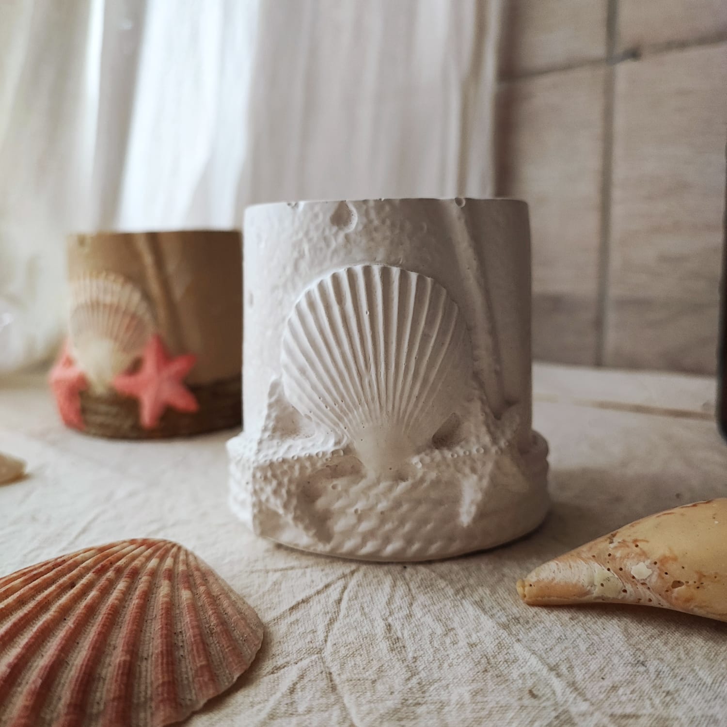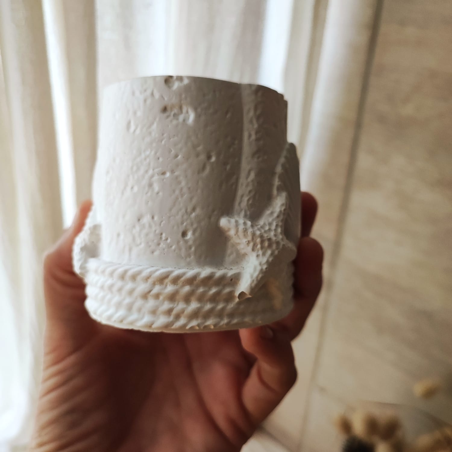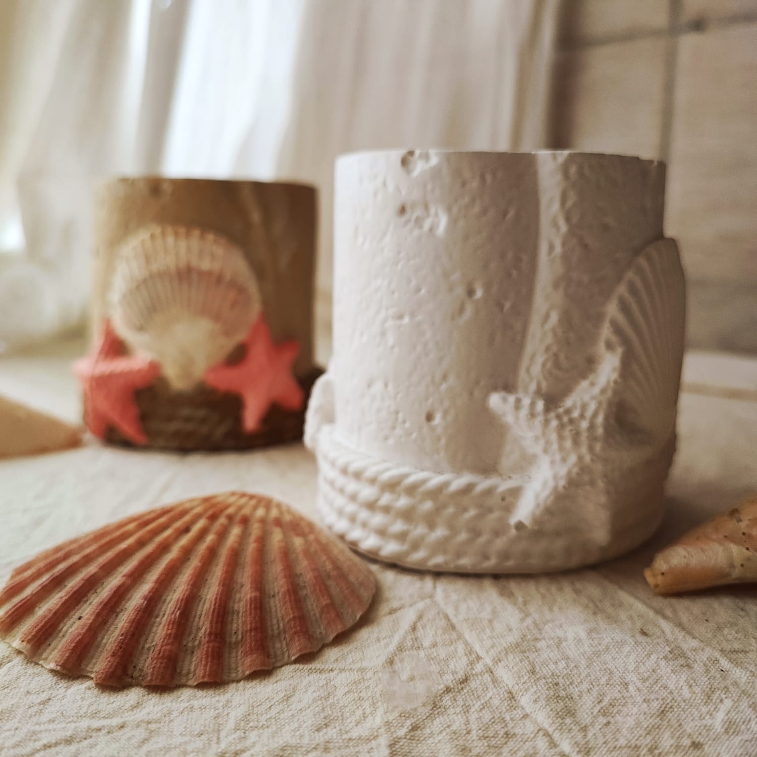 Hermoso contenedor estilo marino, con lindos relieves de estrellas, conchas y sogas. Se lo puede pintar para darle originales toques; ideal para velas, como lapicero, incluso para brochas.