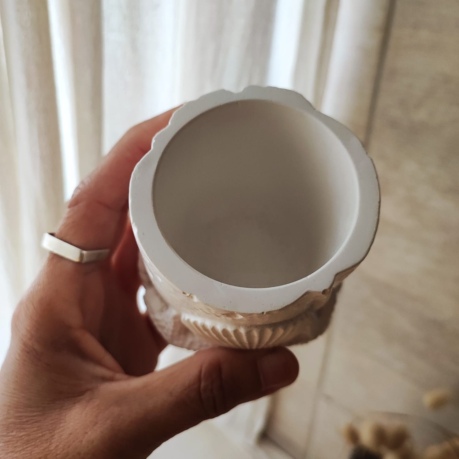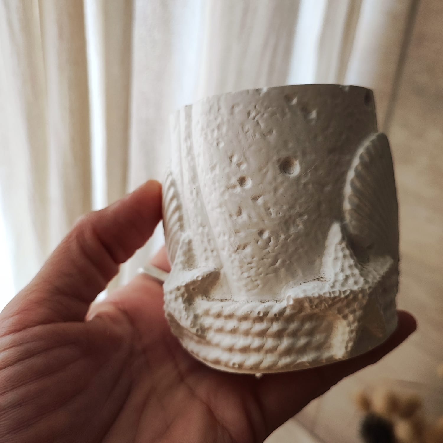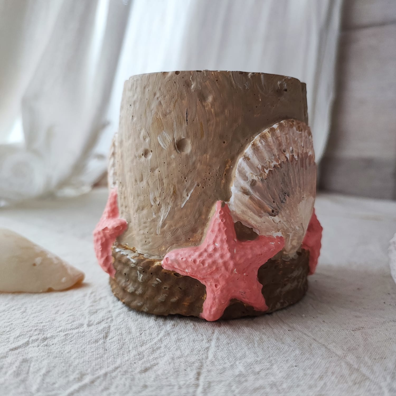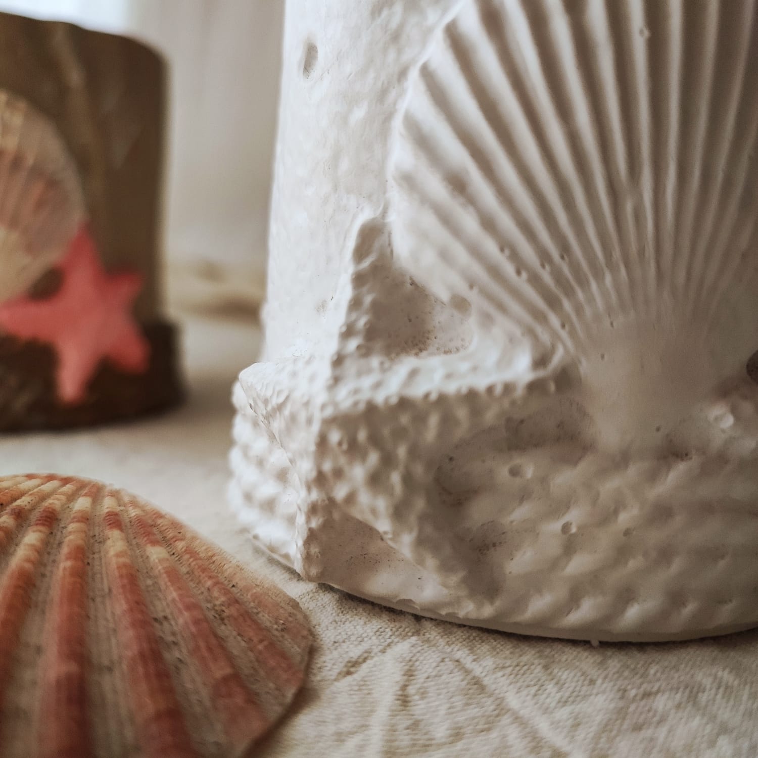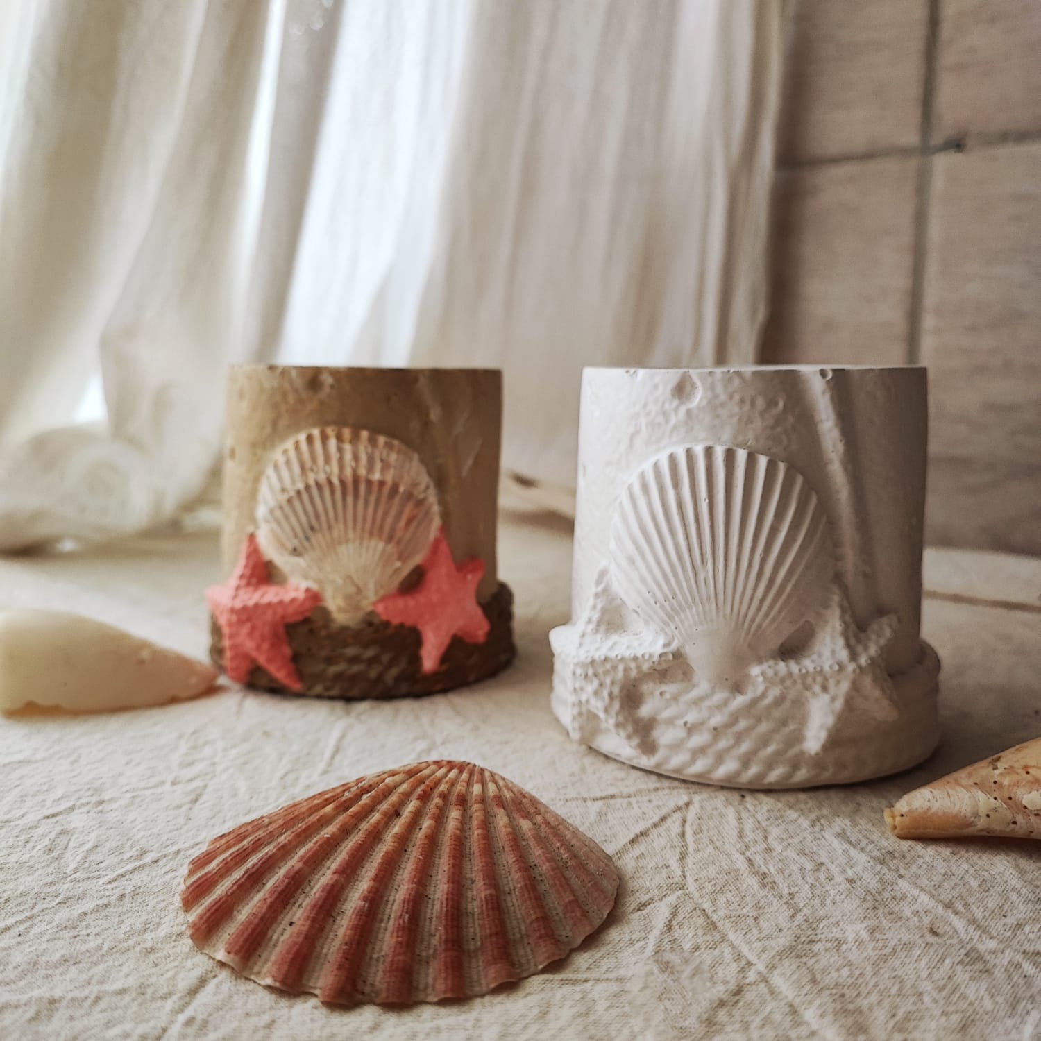 Hermoso contenedor estilo marino, con lindos relieves de estrellas, conchas y sogas. Se lo puede pintar para darle originales toques; ideal para velas, como lapicero, incluso para brochas.