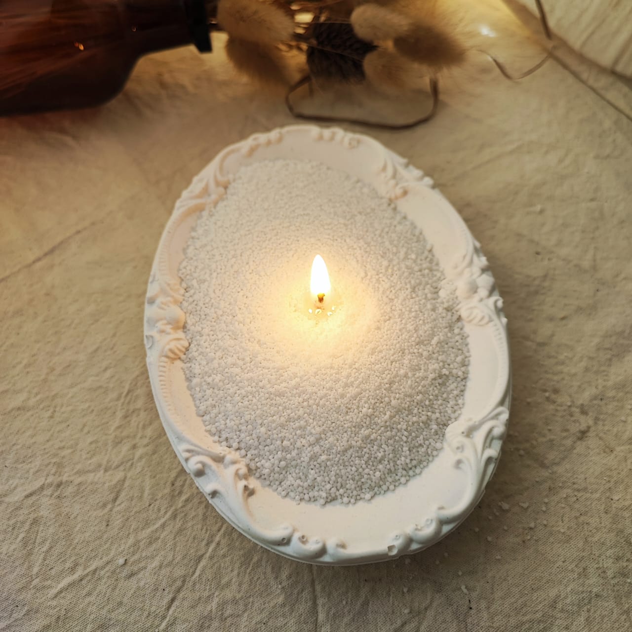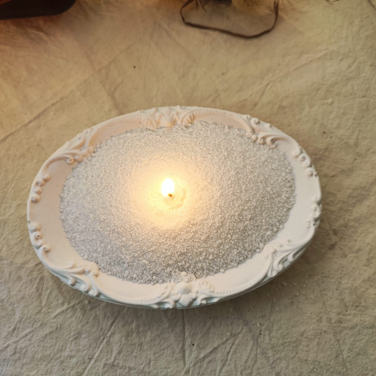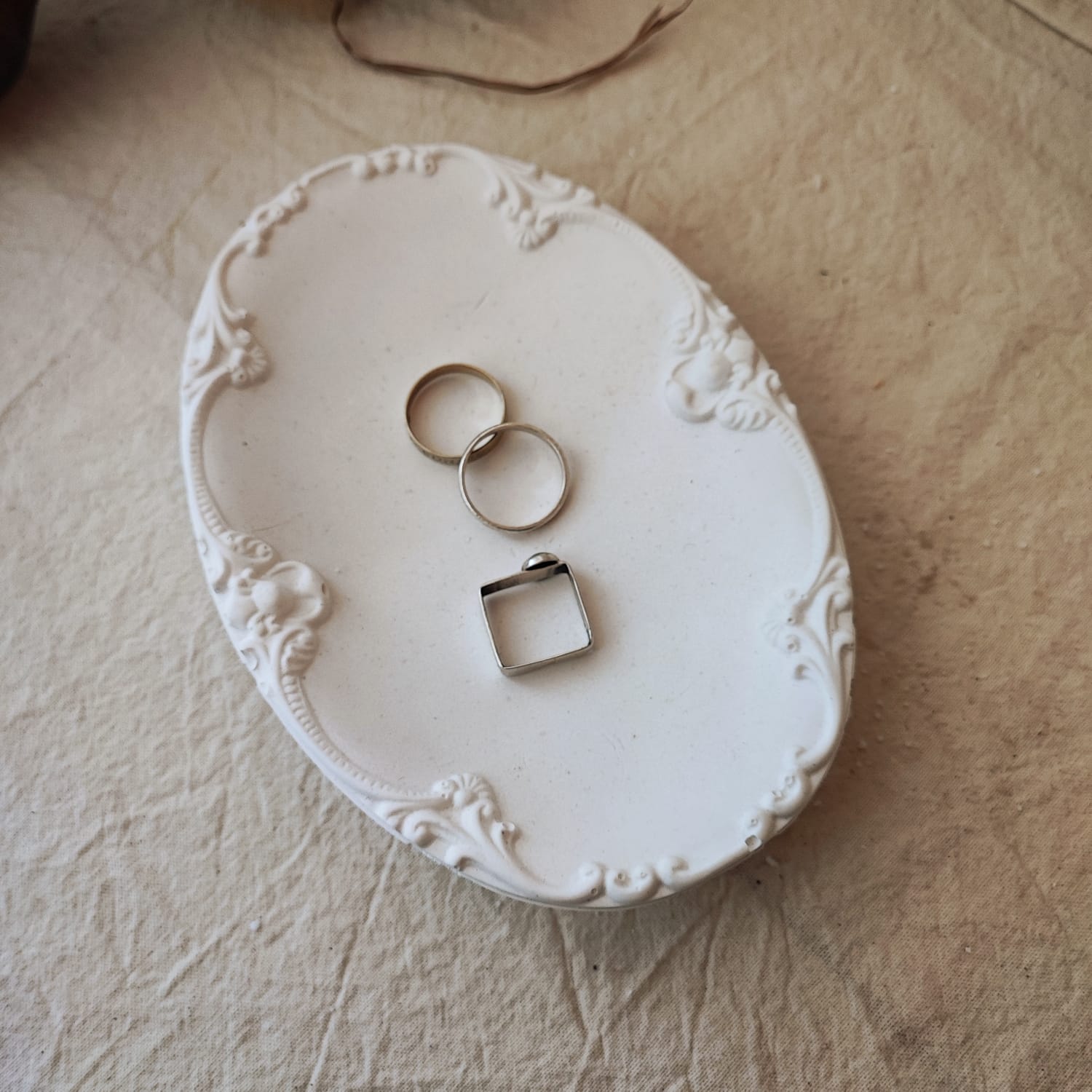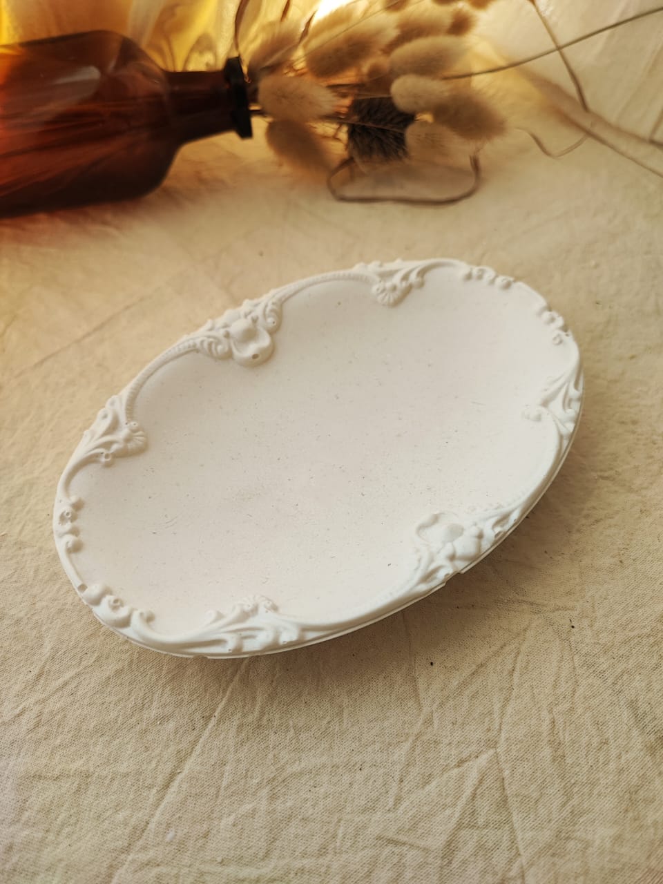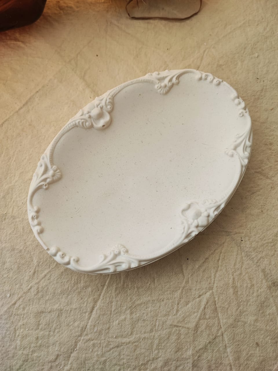 Recien llegada! Muy linda bandeja ovalada, con algo de profundidad, y hermoso relieve sobre los bordes, que le da un tque delicado. Se puede usar como contenedor de cera en perlas, como despojador de joyeria, como plato para recibidores donde poner llaves.