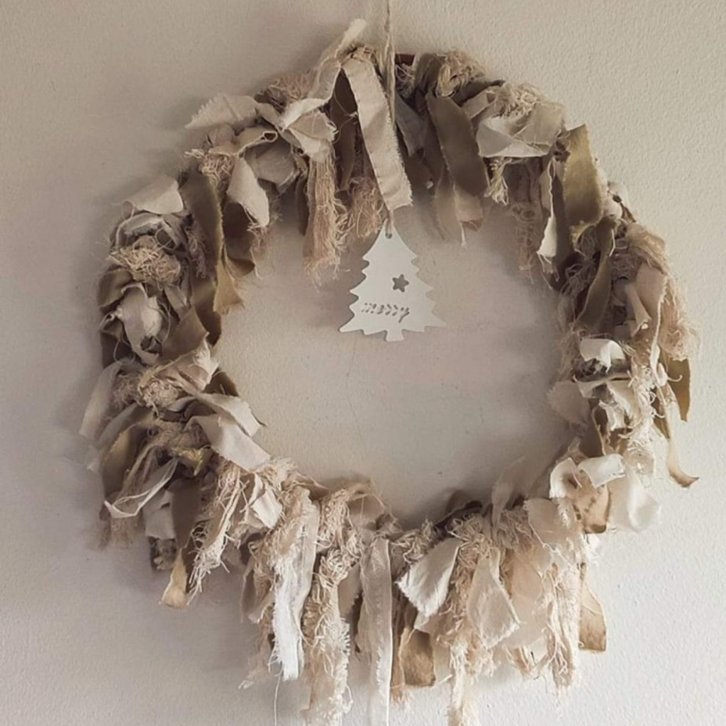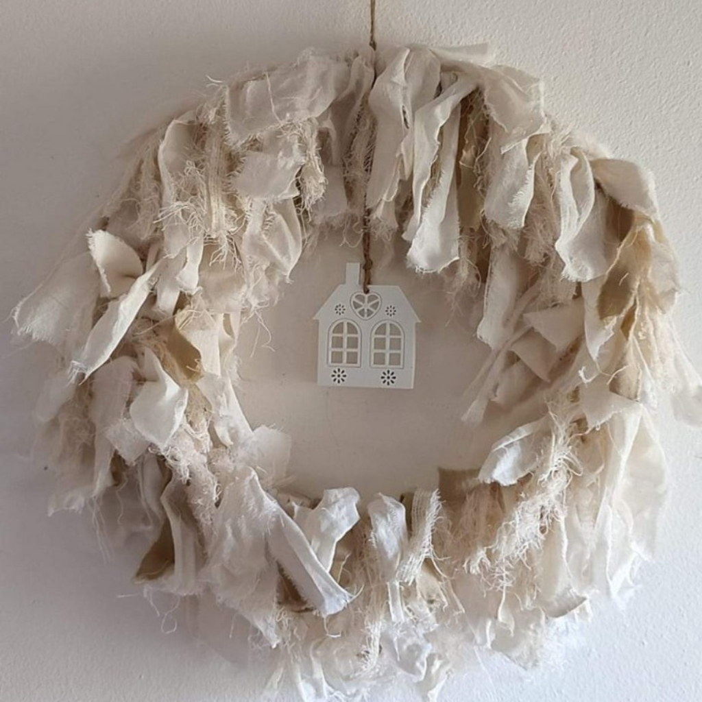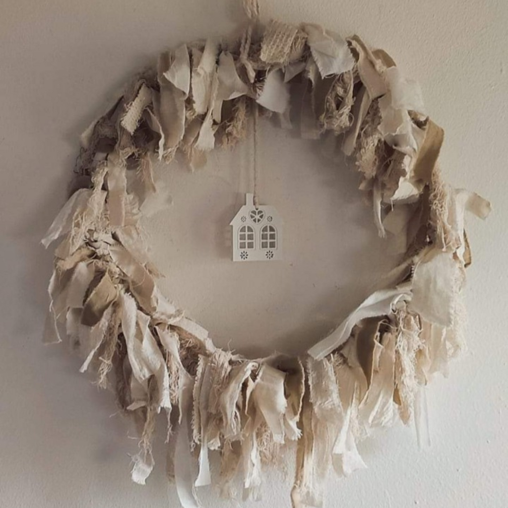 Aro de mimbre con telas y figura en yeso, tematica navideña